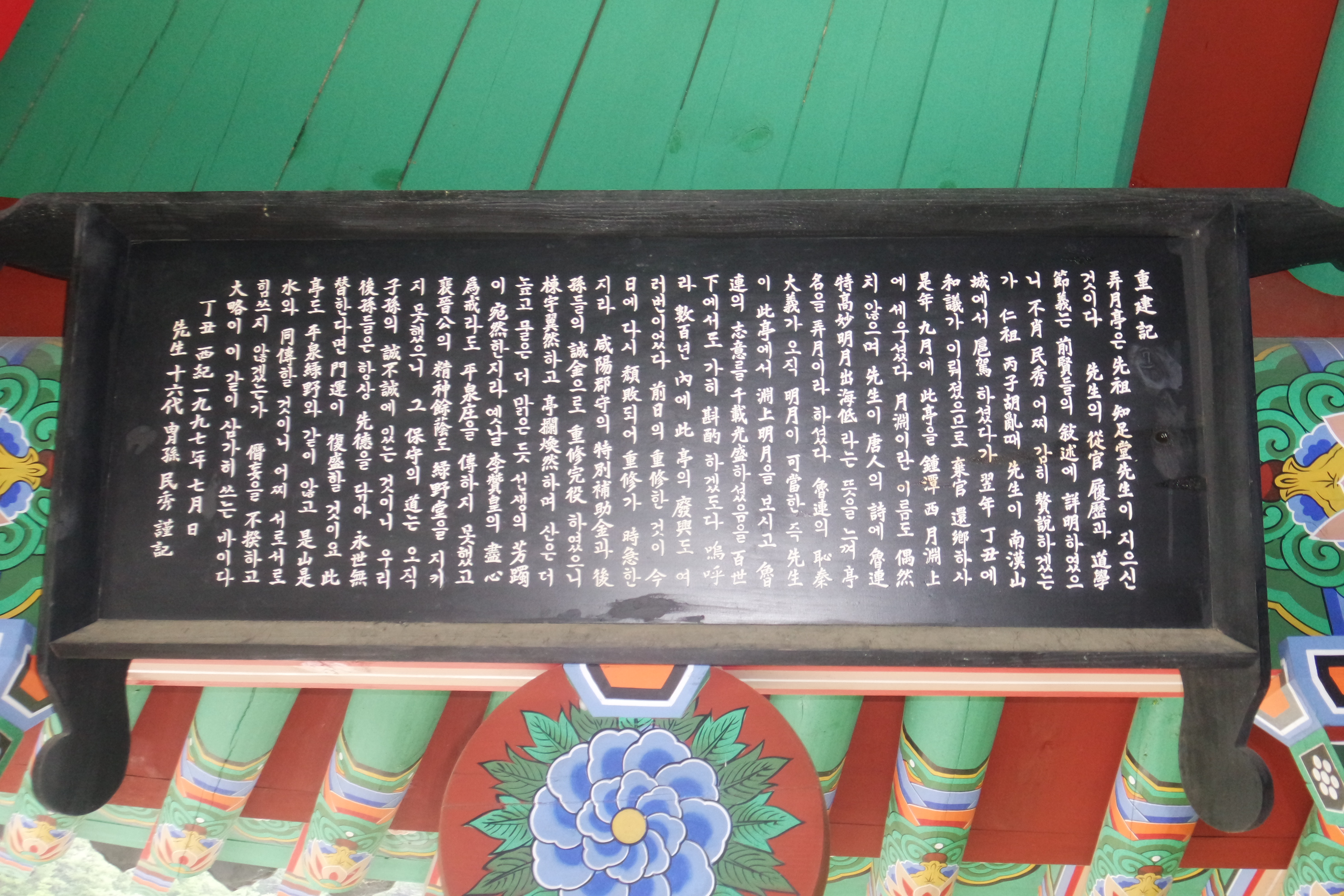 농월정 중건 성금록. 2003년 10월 방화로 추정되는 화재로 소실, 2015년에 함양군에서 새로 건립하였다.
