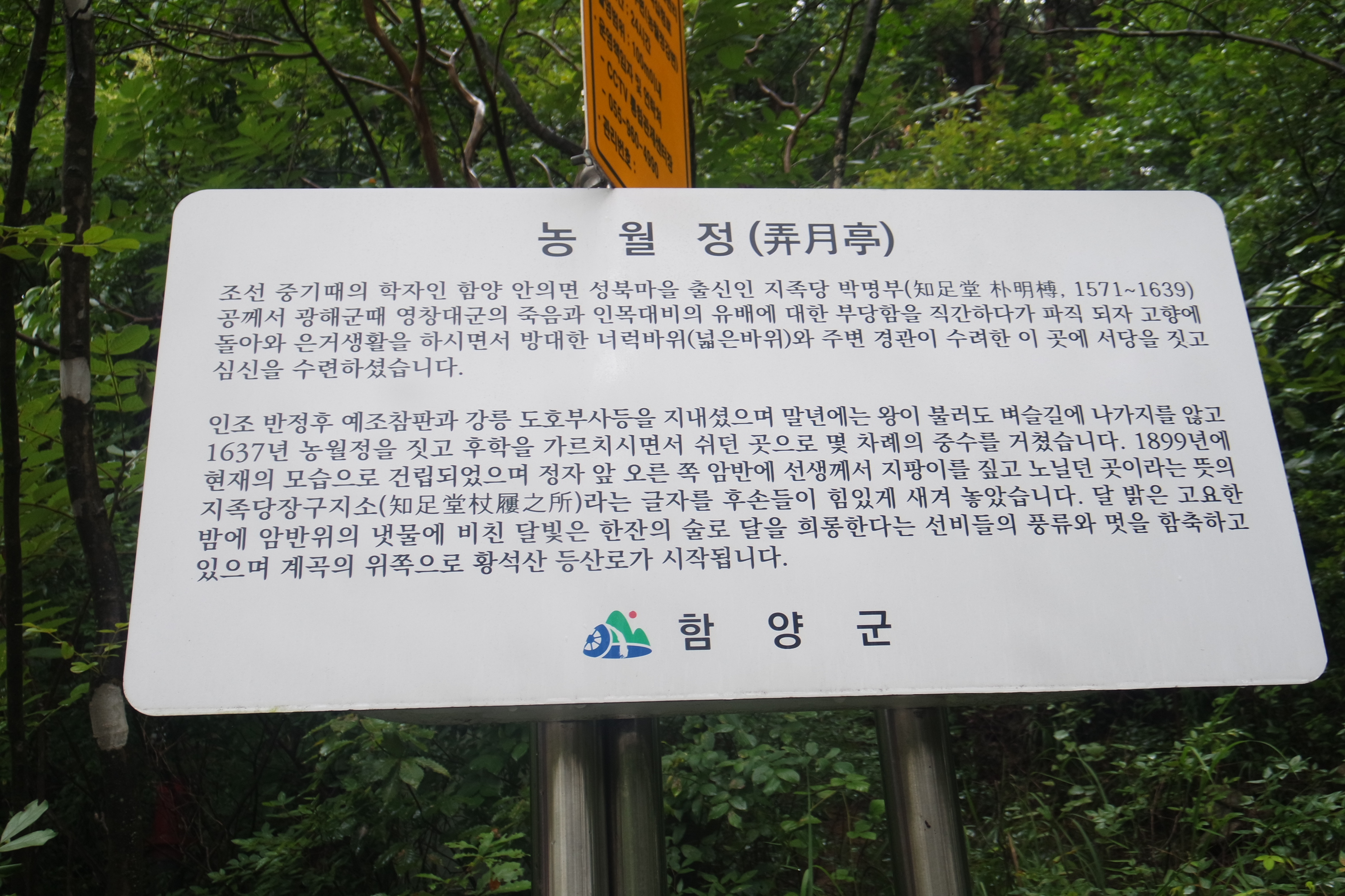조선 중기때 학자인 지족당 박명부 선생은 함양 안의면 성북마을에 1571(선조 4년) 태어나셨고, 광해군때 영창대군의 죽음과 인목대비의 유배에 대한 부당함을 직간하다가 파직되어 고향에 돌아와 은거생활을 하시면서 너럭바위와 주위경관이 수려한 이 곳에 서당을 짓고 심신을 수련 하였다.