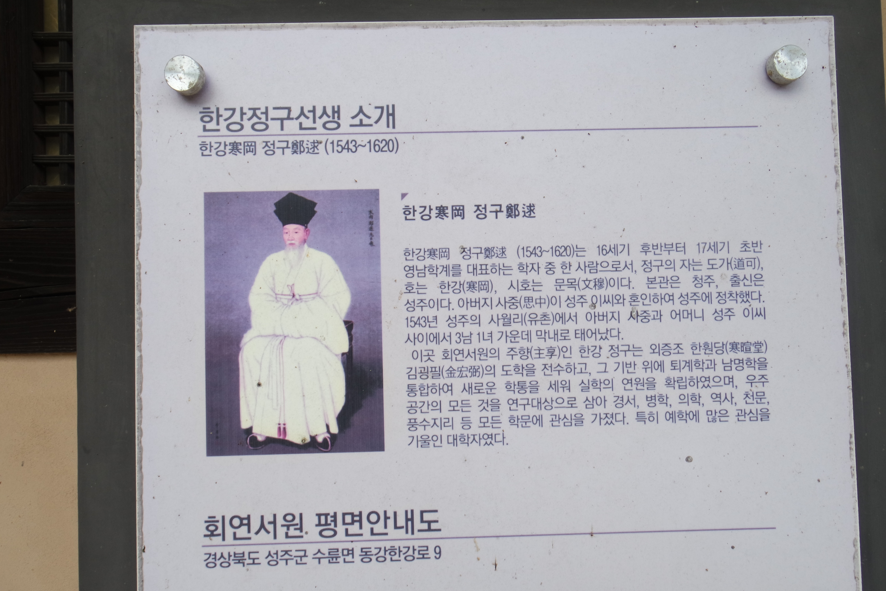 회연서원은 1622년(광해군 14)에 지방유림의 공의로 정구와 이윤우의 학문과 덕행을 추모하기 위해 창건, 위패를 모셨다. 1690년(숙종 16)에 ‘회연(檜淵)’이라 사액을 받아 선현배향과 지방교육의 일익을 담당하여왔다.