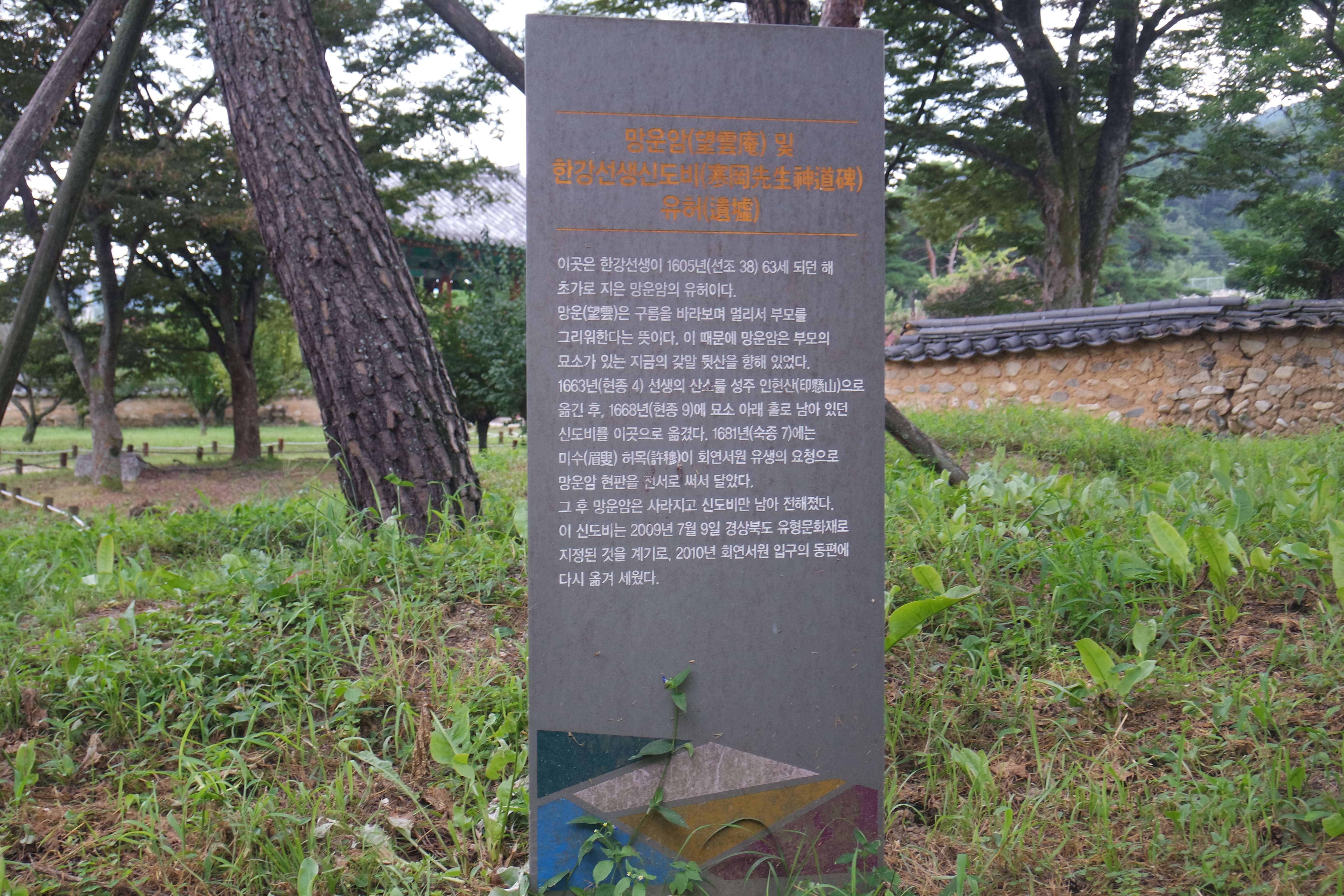 한강 정구 선생이 63세에 초가를 지었다는 망운암의 유허를 알리는 안내문이 있다.