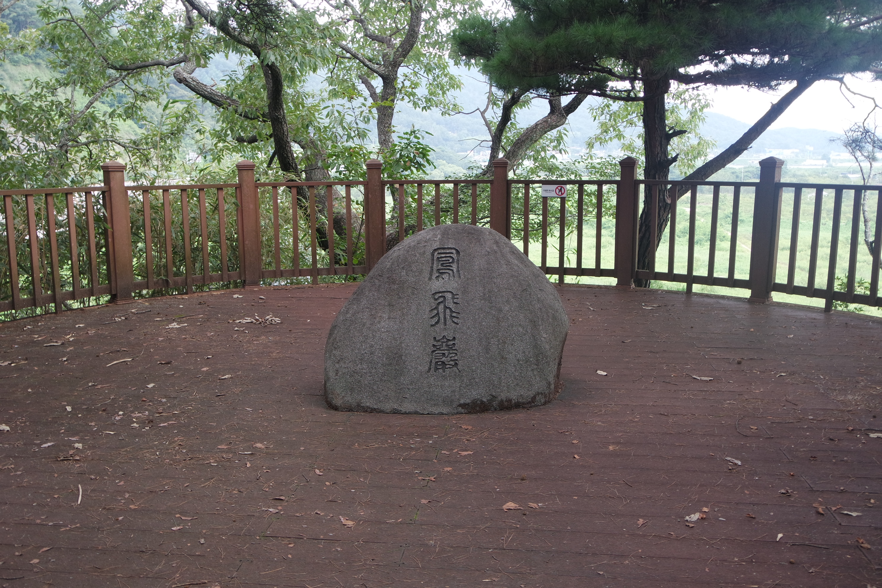 전망대 정상 데크중앙의 봉비암. 나지막한 높이지만 뒤쪽에는 낭떠러지로 밑에는 대가천이 흘려 예전에 이곳에서 연회가 벌어졌다고 한다.