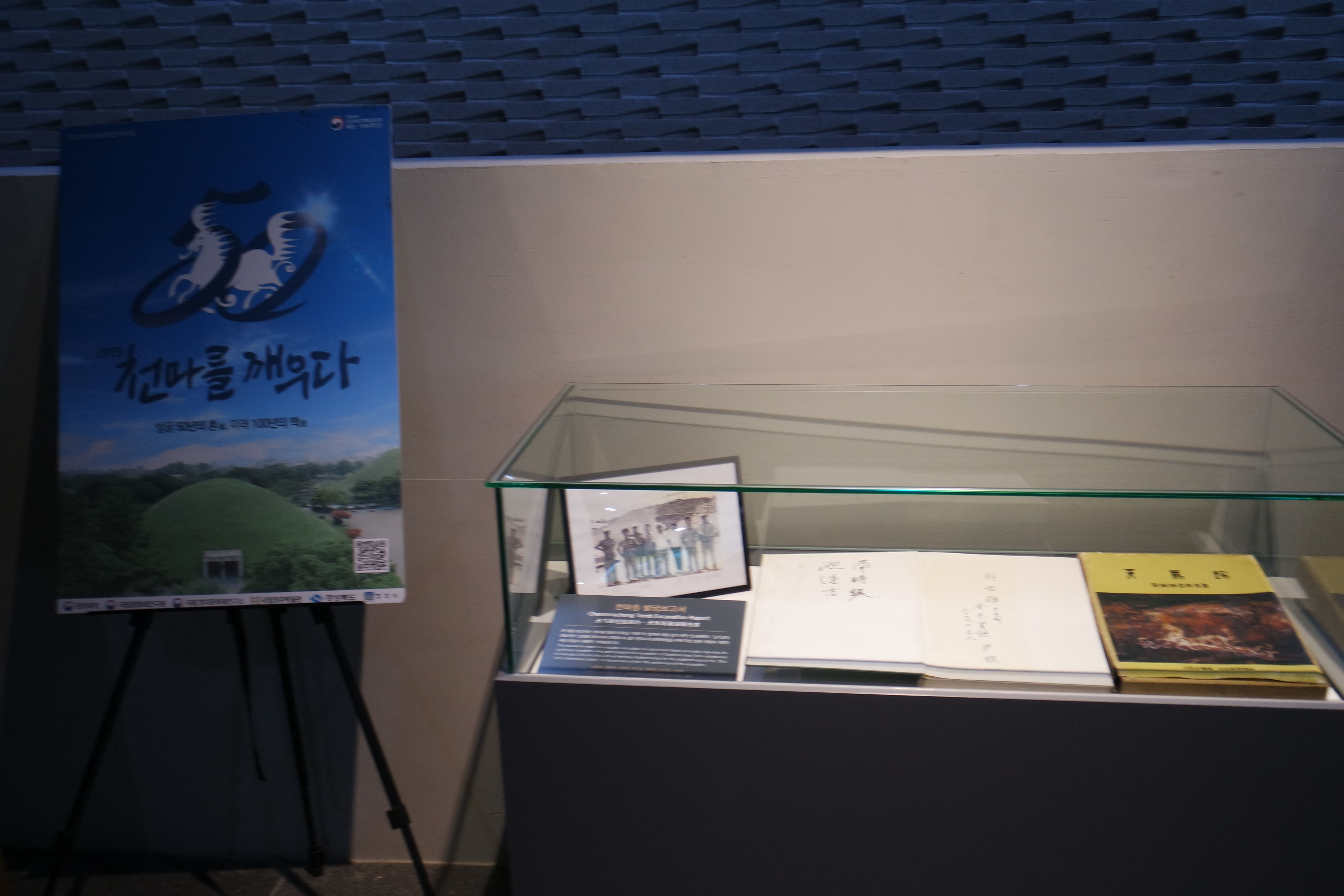 '천마를 깨우다' 천마총을 발굴한 고고학분들의 사진과 천마총 발굴 보고서.