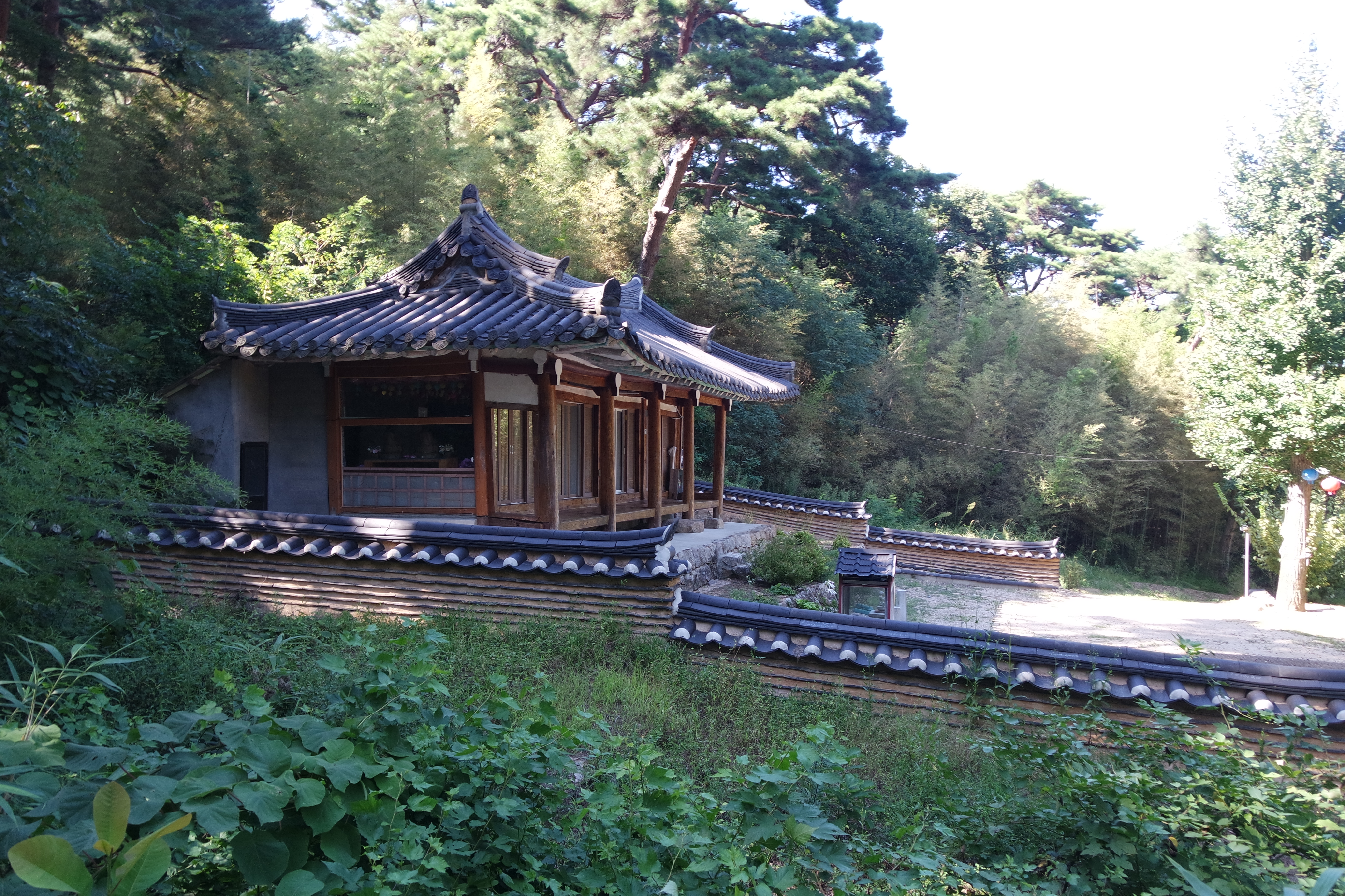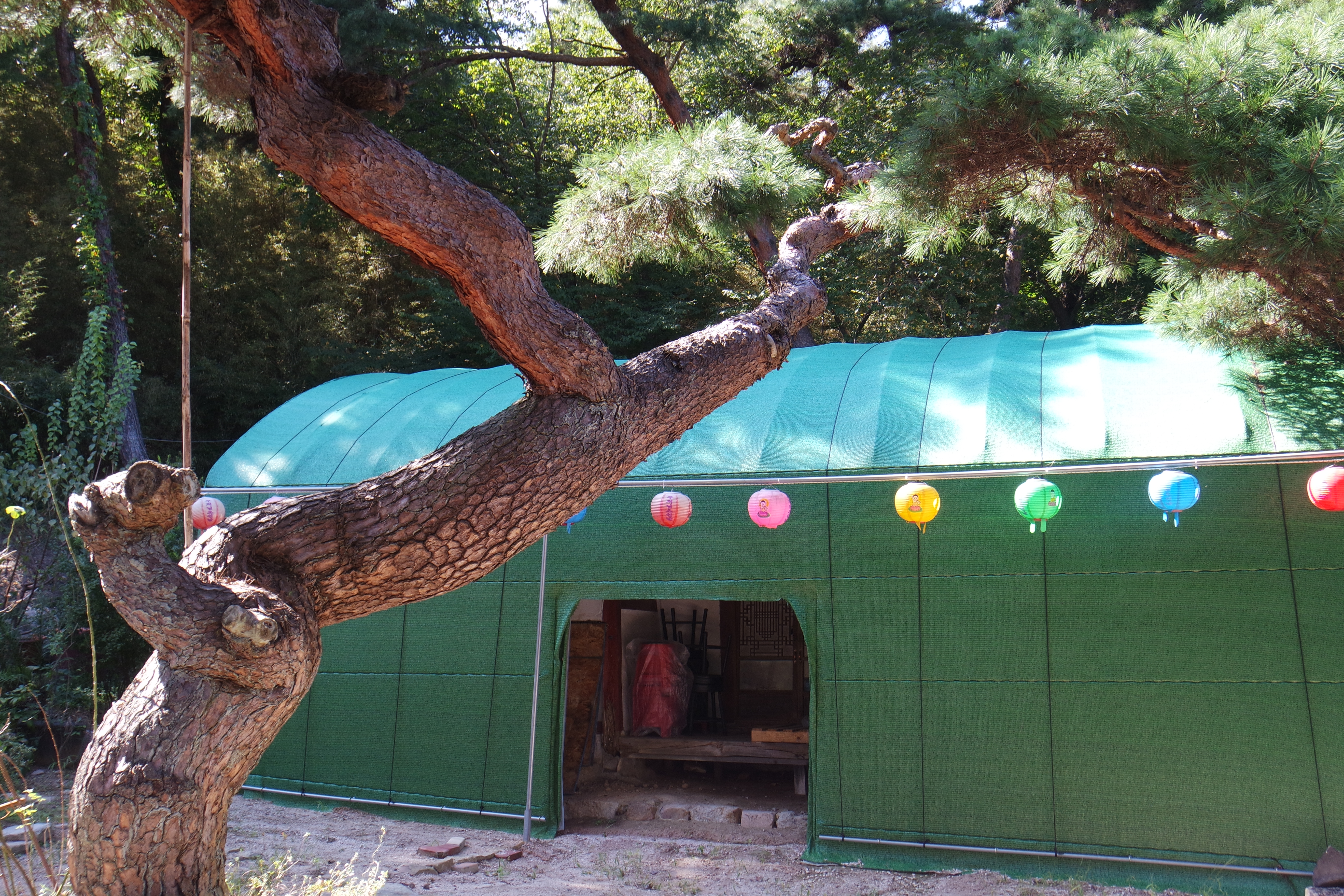 더 이상의 허물어짐을 방지하기 위해서 초록색 하우스 로 삼소헌을 보호하고 있다.