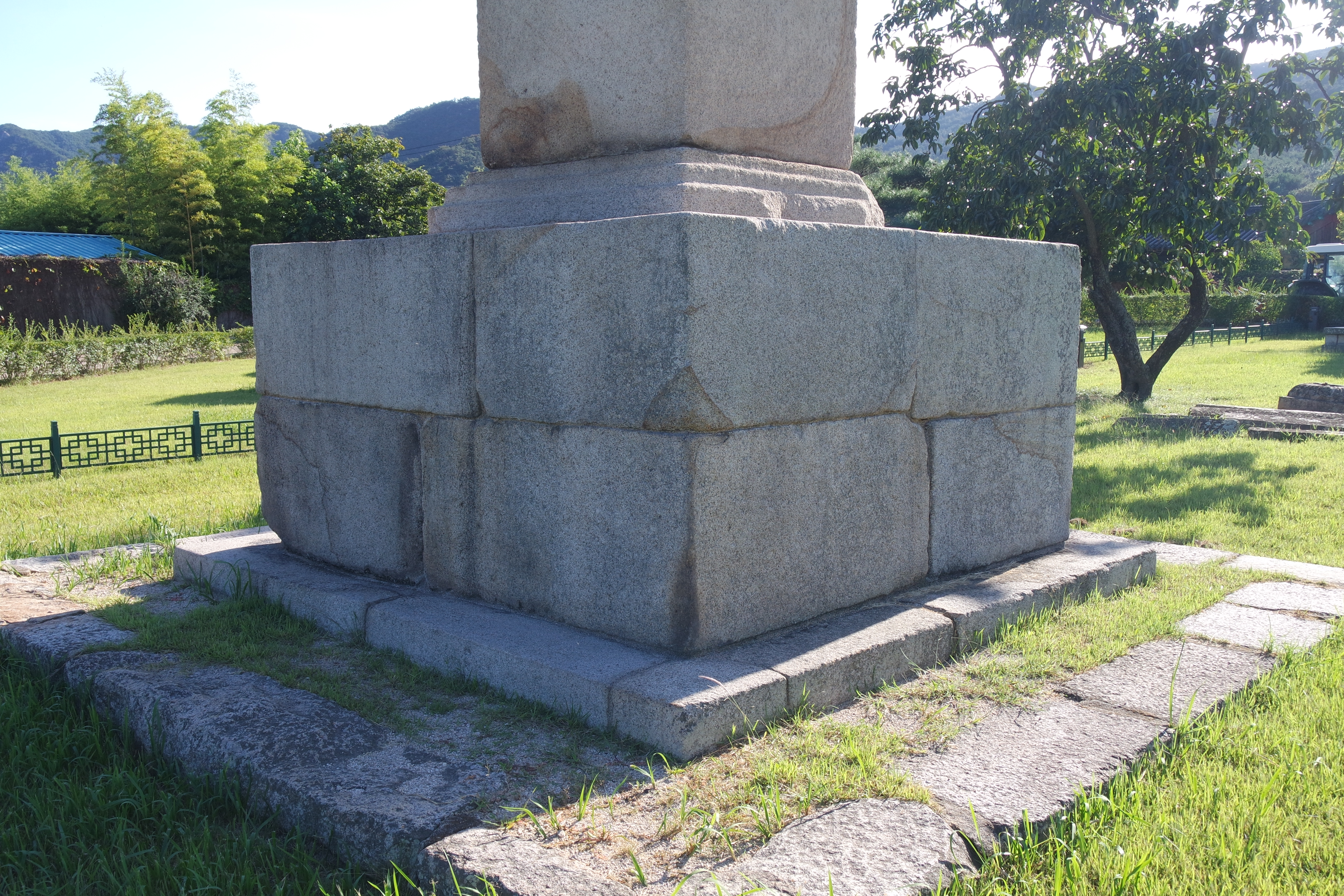 넓은 2중의 지대석 위에 잘 다듬어진 8개의 기단석을 커다란 괴체형 (덩어리모양)으로 처리하여 입방체의 단층기단을 형성하였다. 기단의 윗면에는 3단의 각형 굄을 마련하여 탑신부를 받치게 하였다.