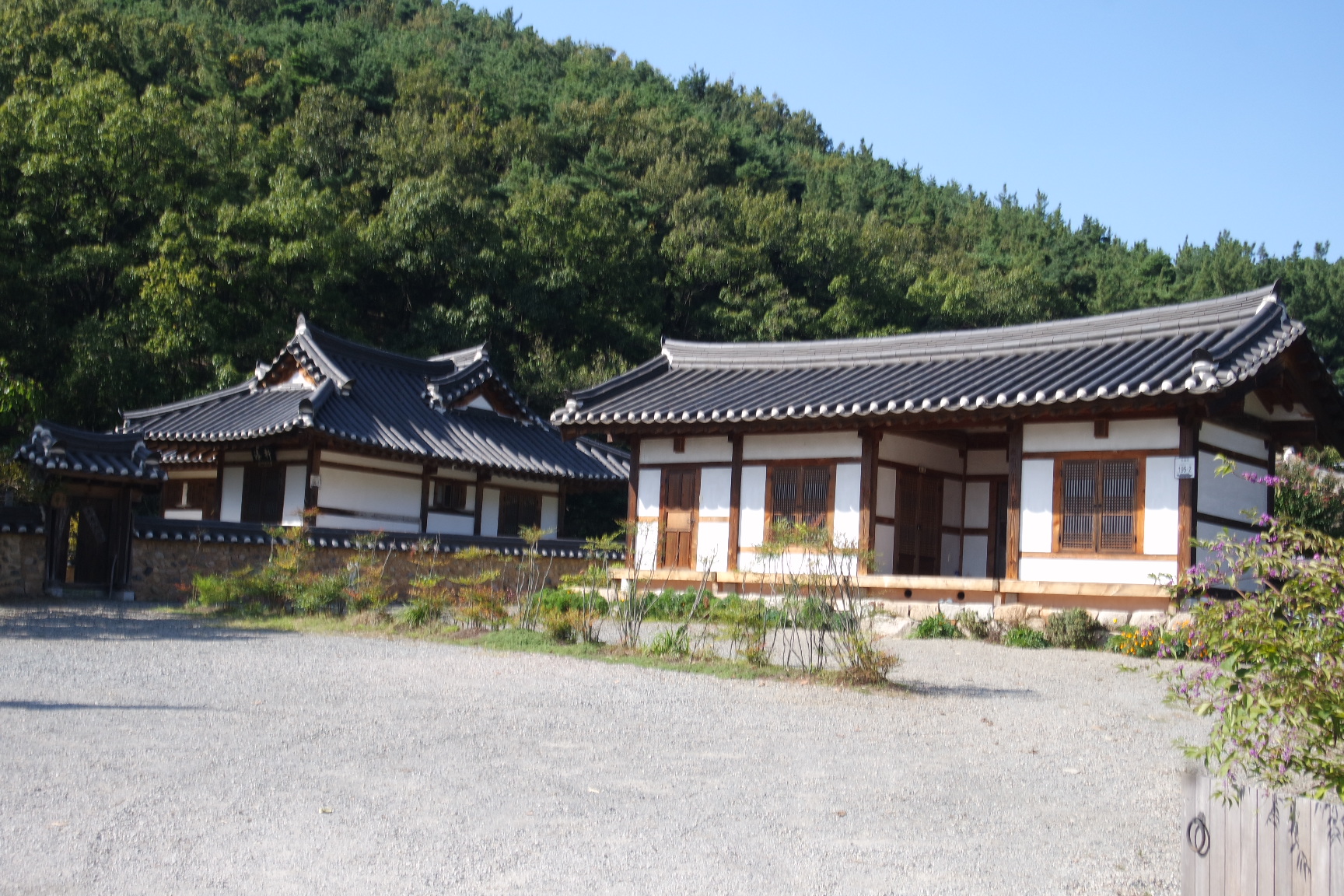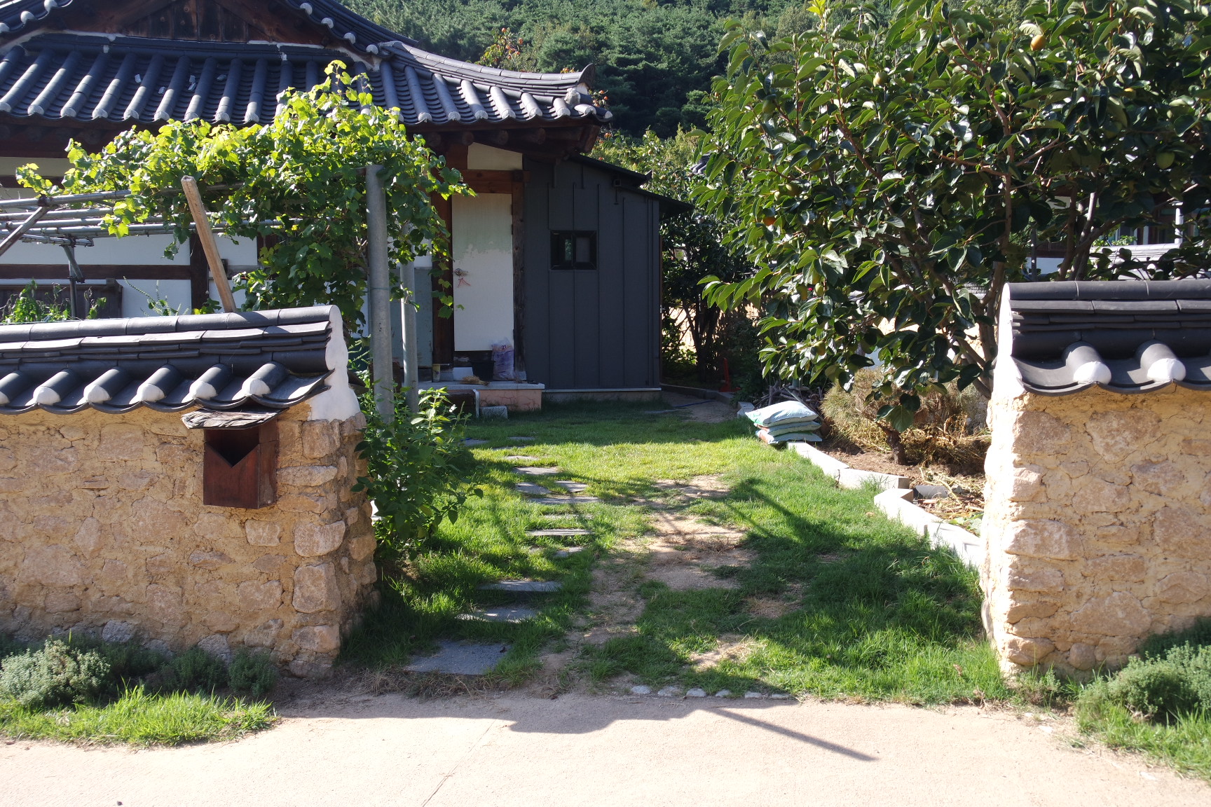 대문은 없고 담장만 좌우로 설치.