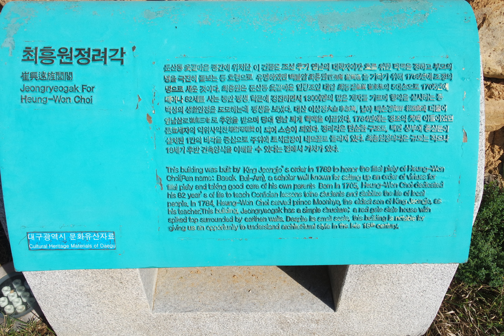 백불암 최흥원 정려각 안내문.