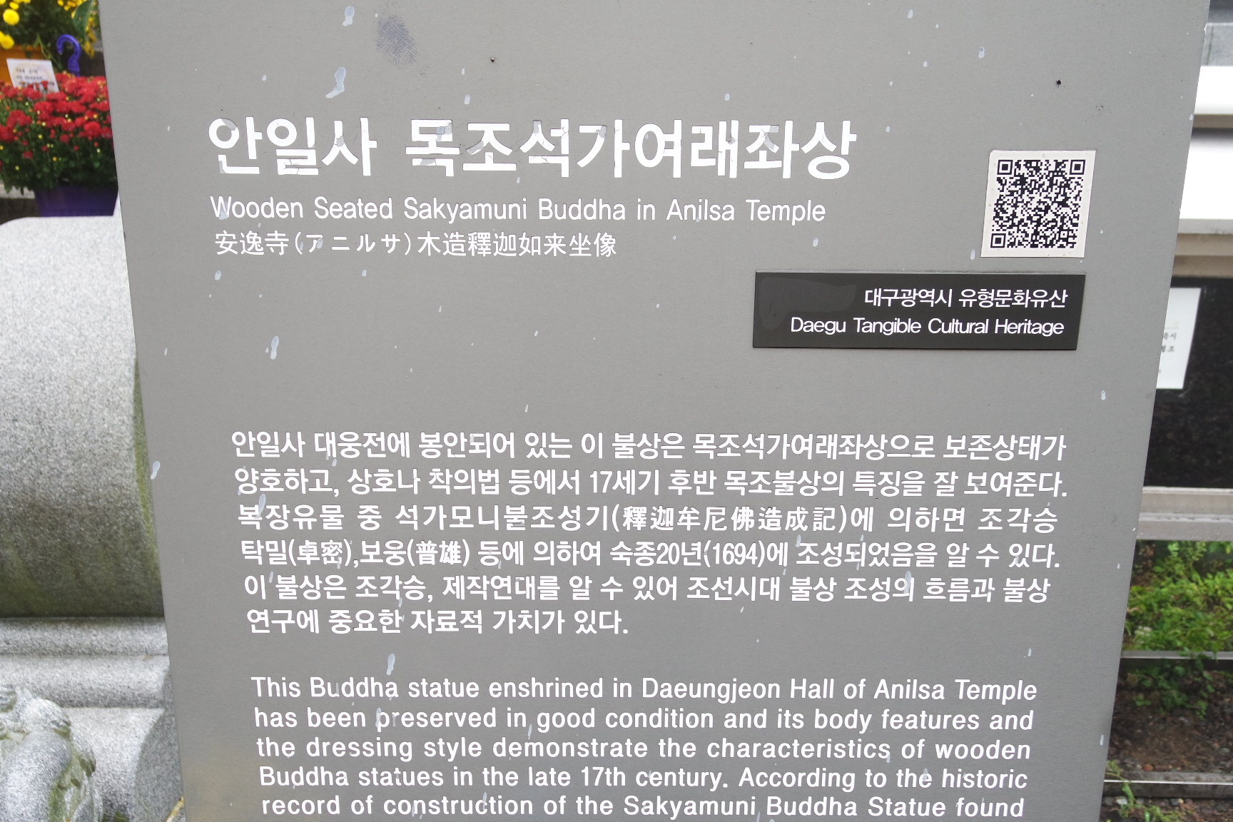대웅전 내 목조석가여래좌상 안내문.