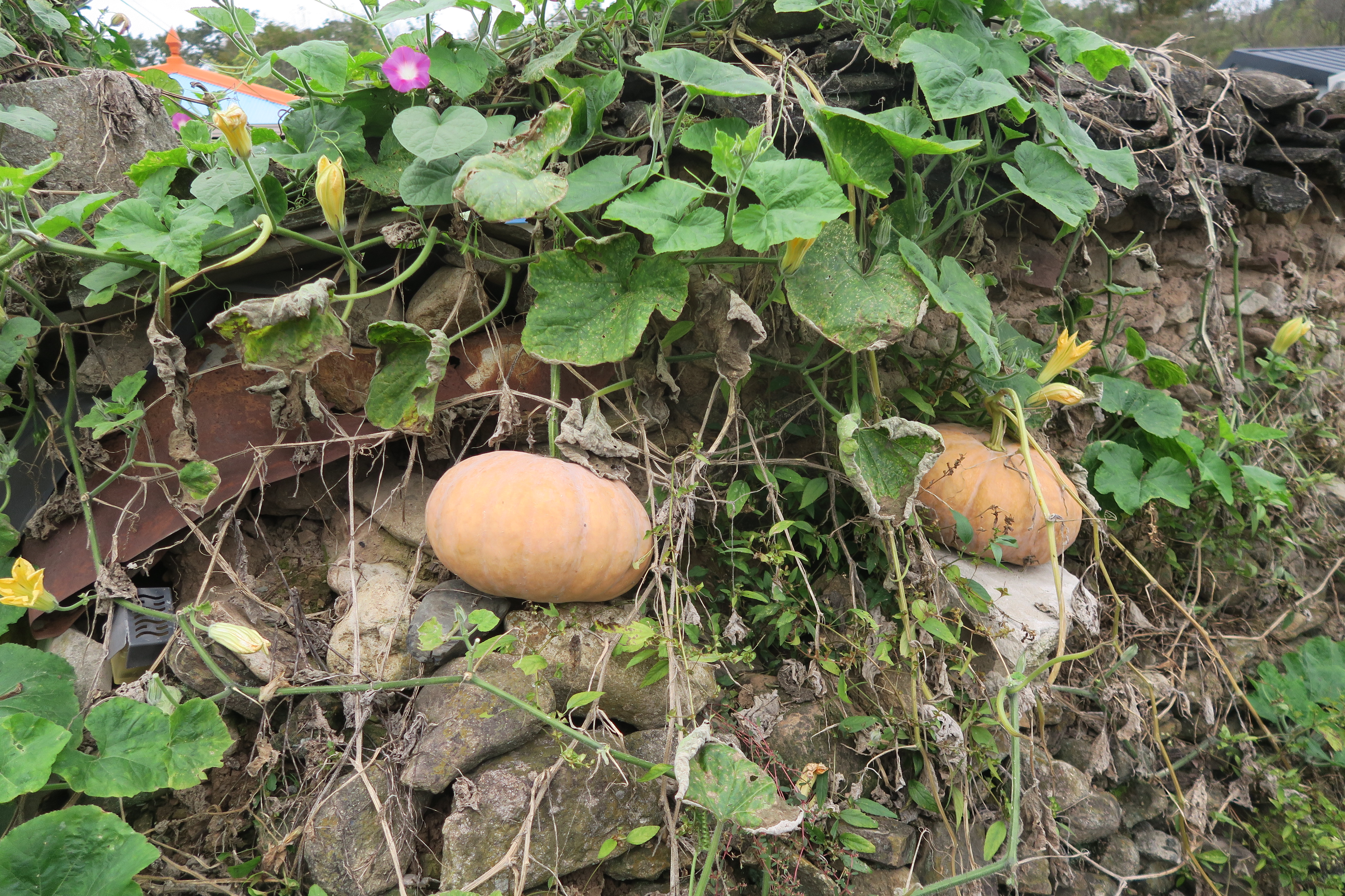 돌담의 풍요로운 호박.