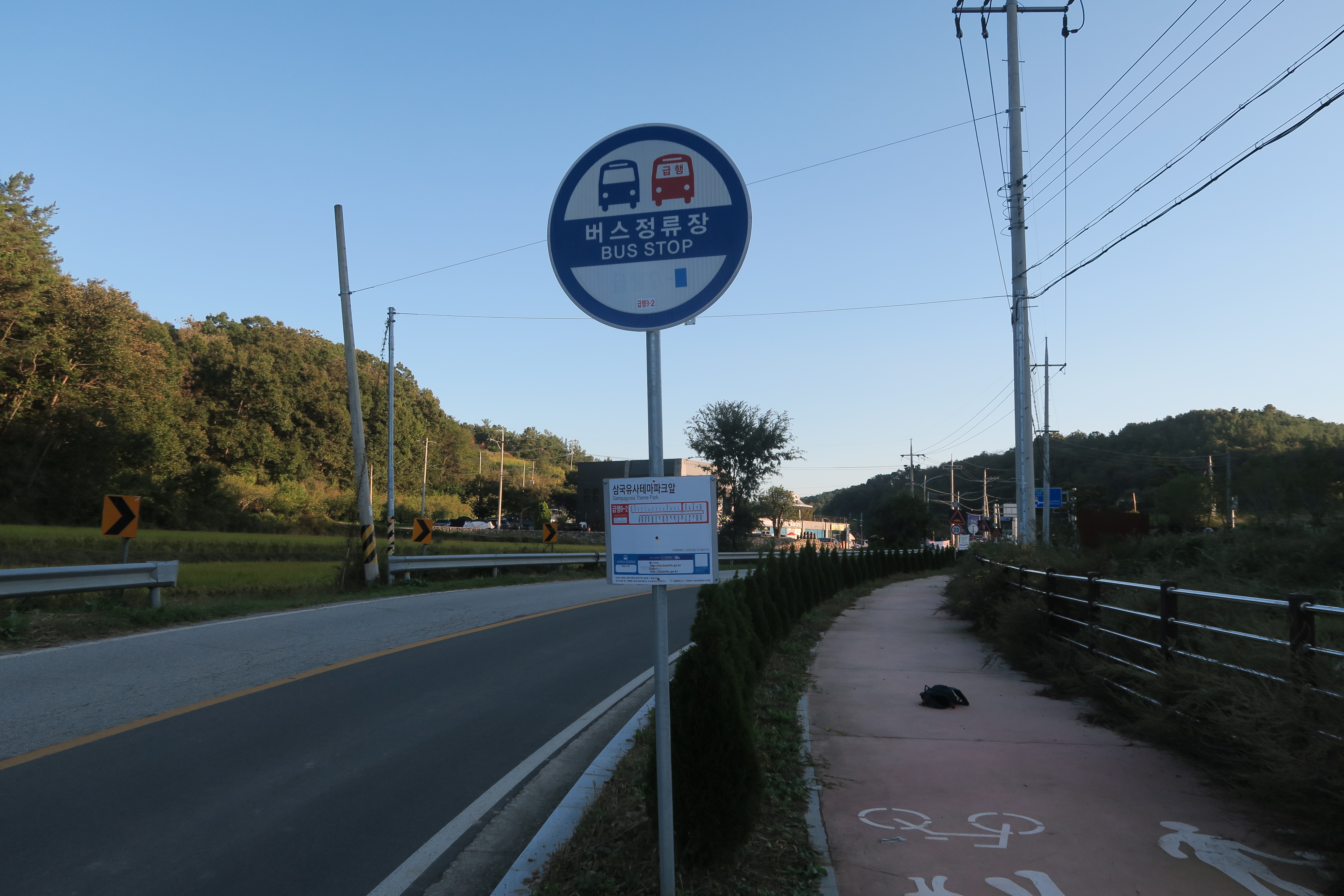 삼국유사 테마파크 앞 버스 정류장. 급행9-2 버스를 타고 집으로 이동.