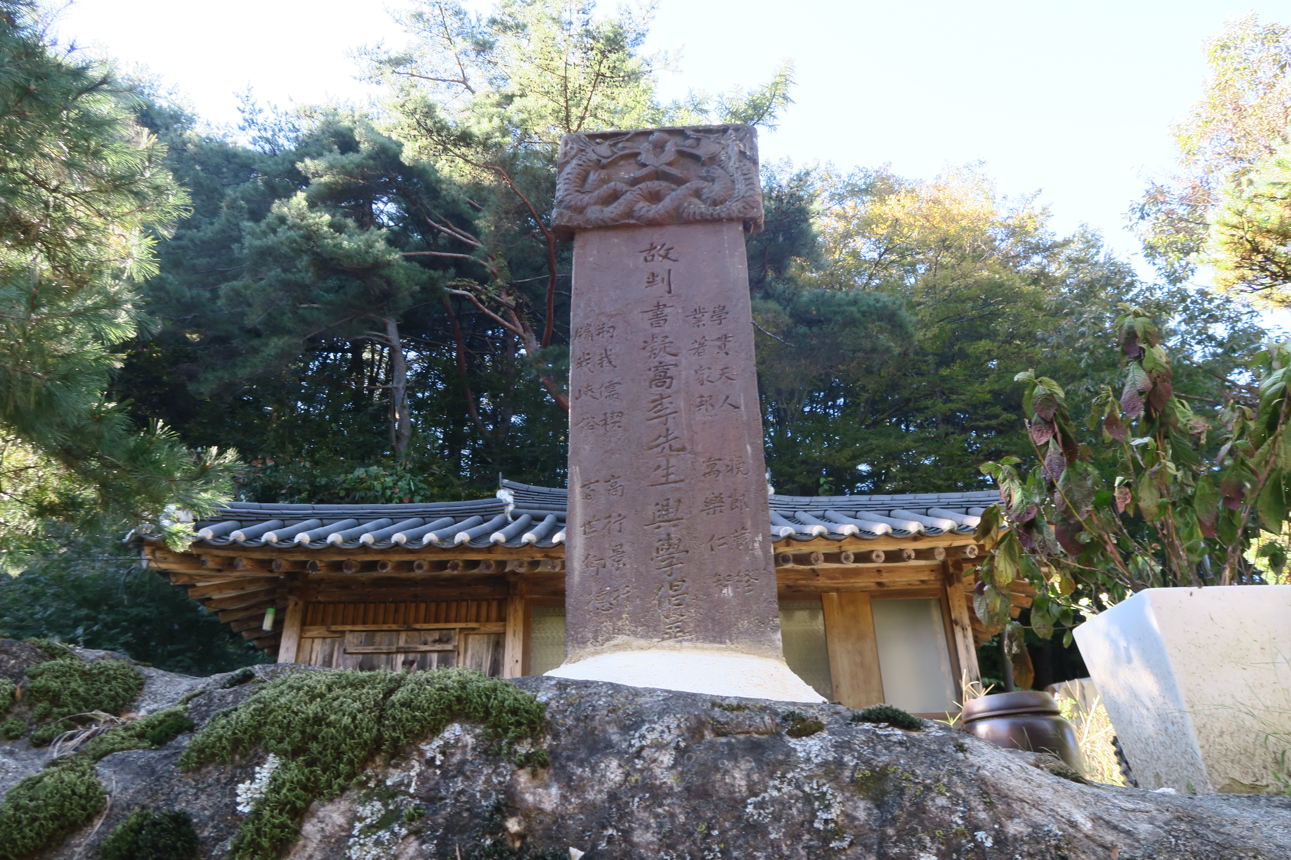 돌담위에 고 판서 응와 이선생 흥학창성비, 학문 진흥에 대한 의지를 담은 비가 서 있다.