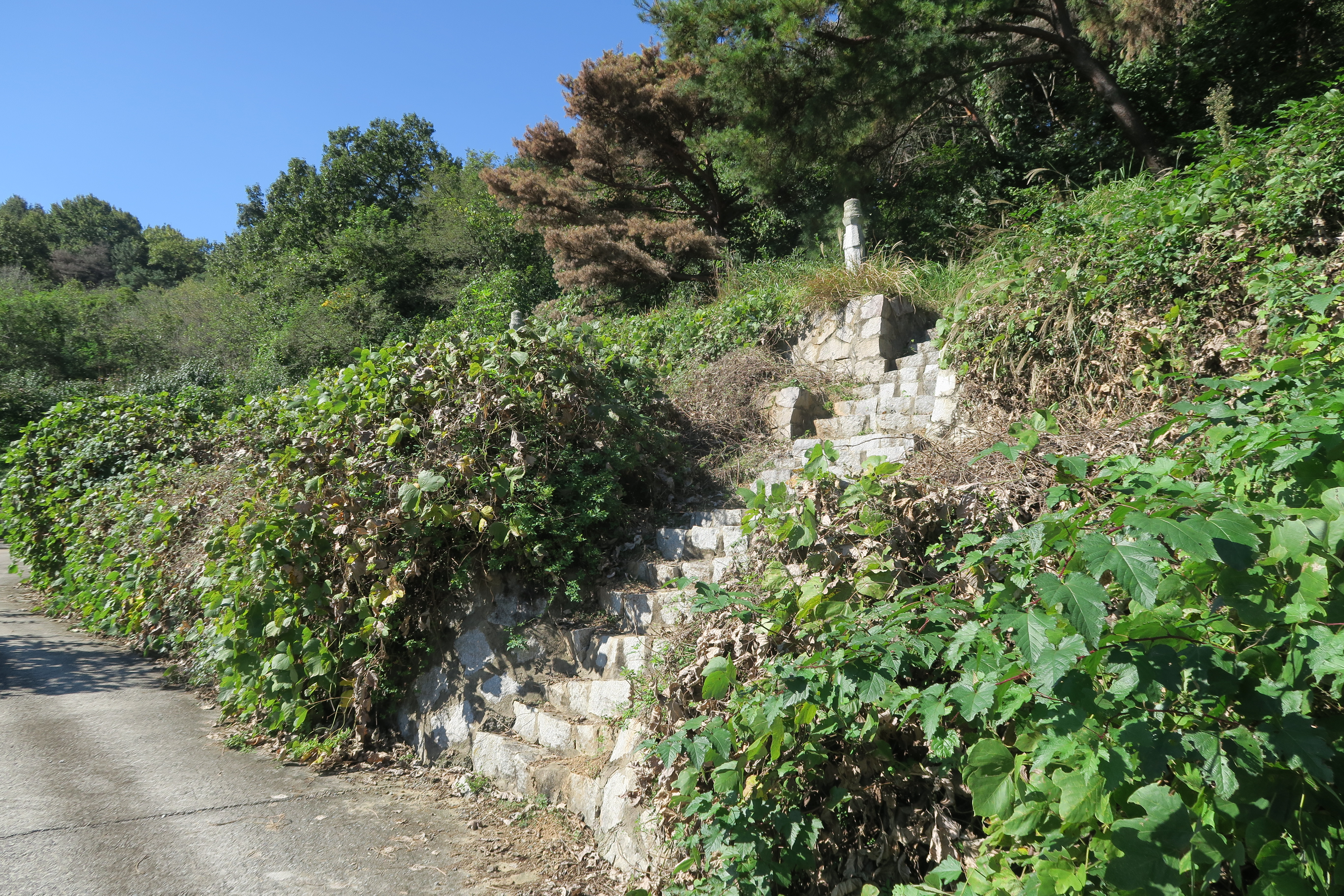 돌계단으로 올라갔으나 풀이 무성해 내려온다. 이정표가 없어 찾기가 어려워 폄을 해 온다.