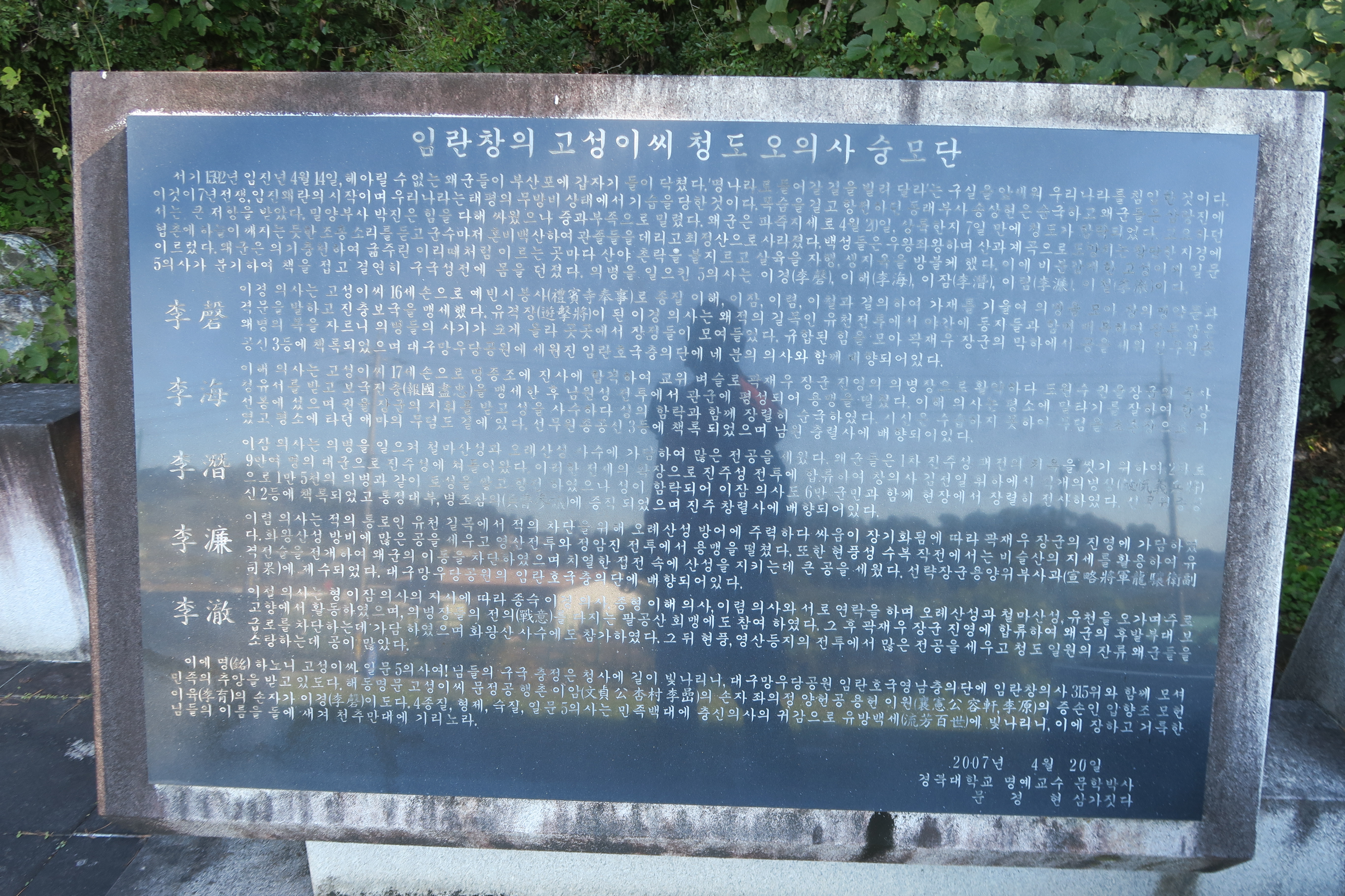 임란창의 고성이씨 청도 오의사 숭모단.