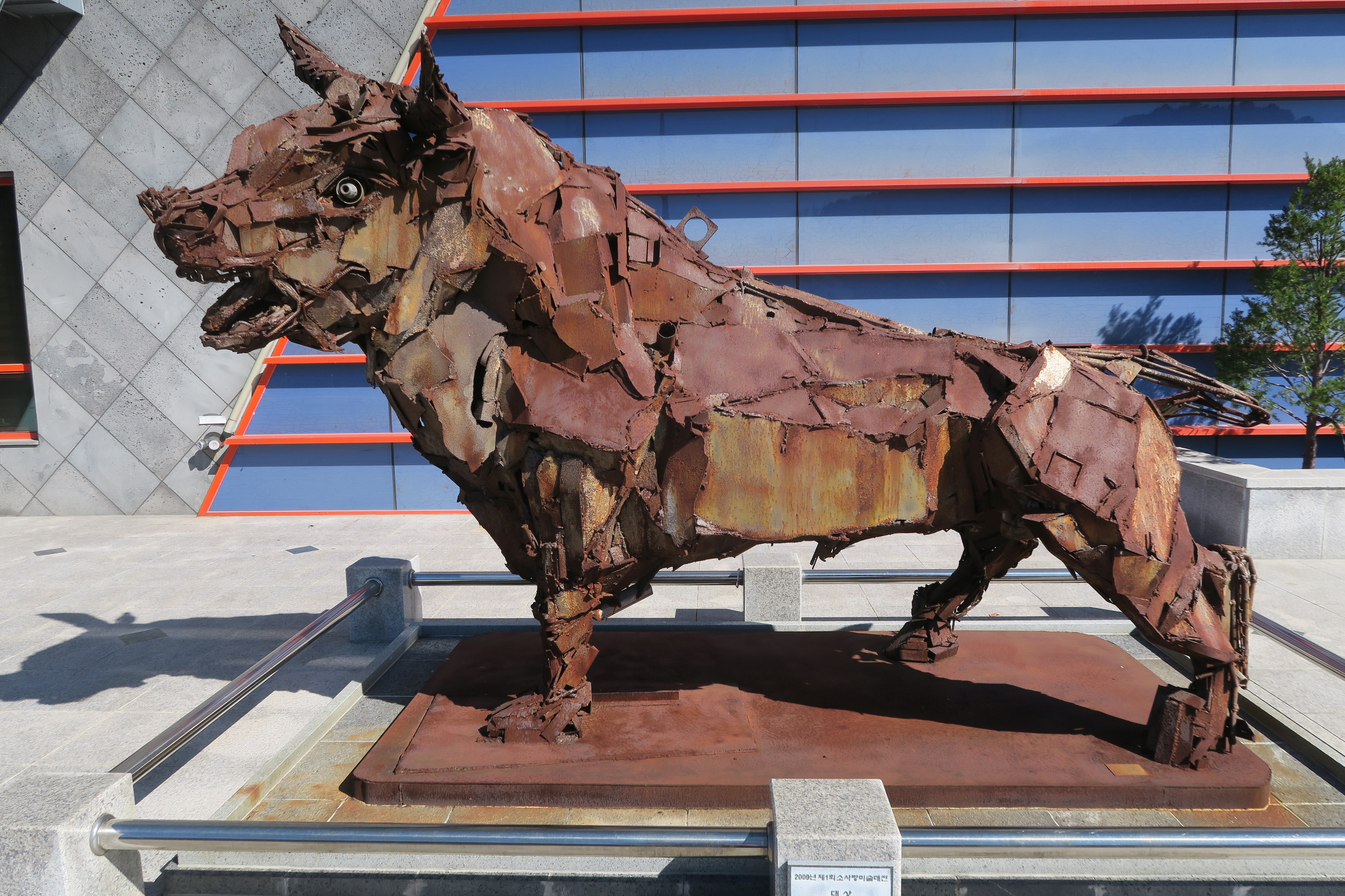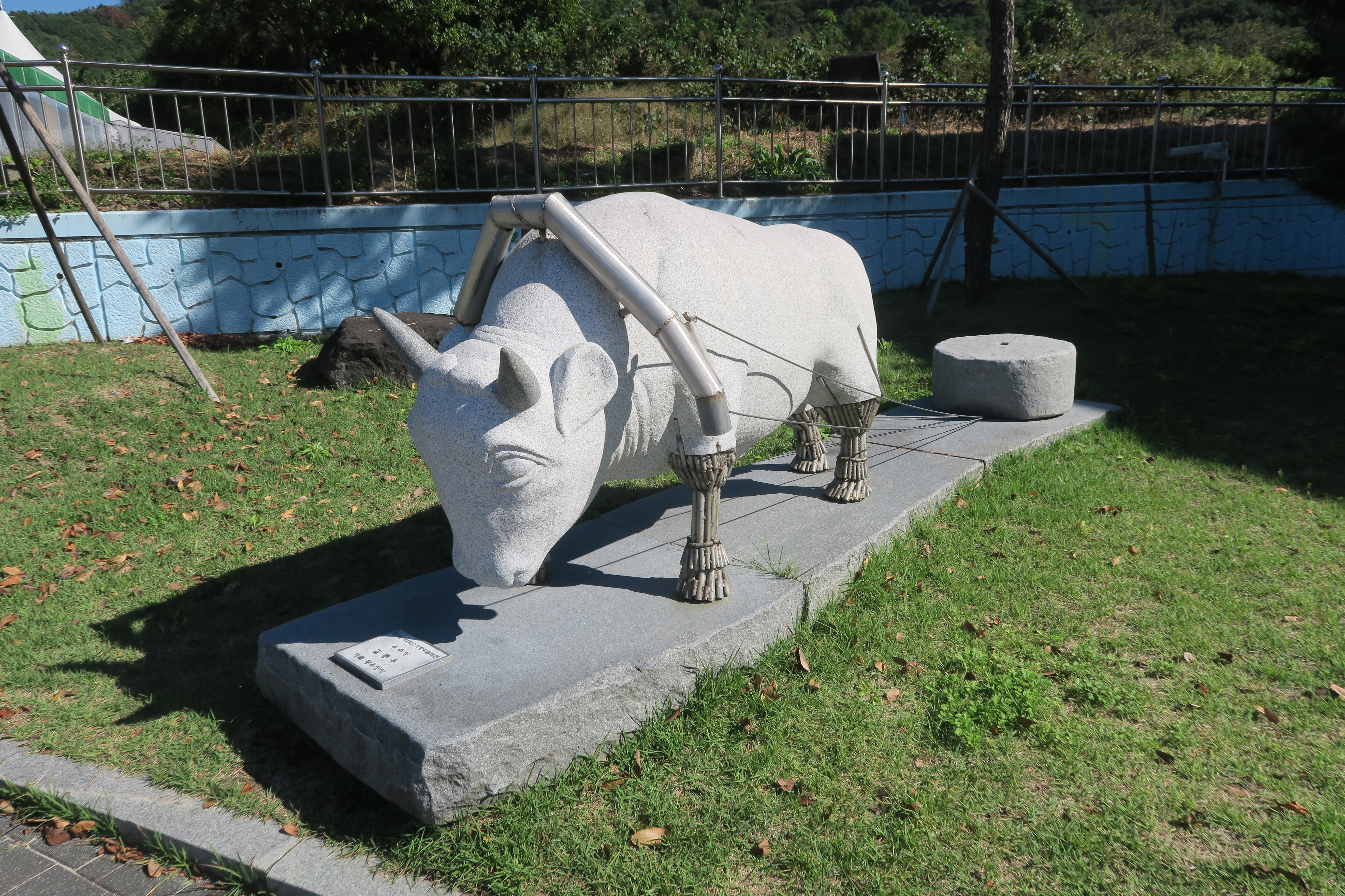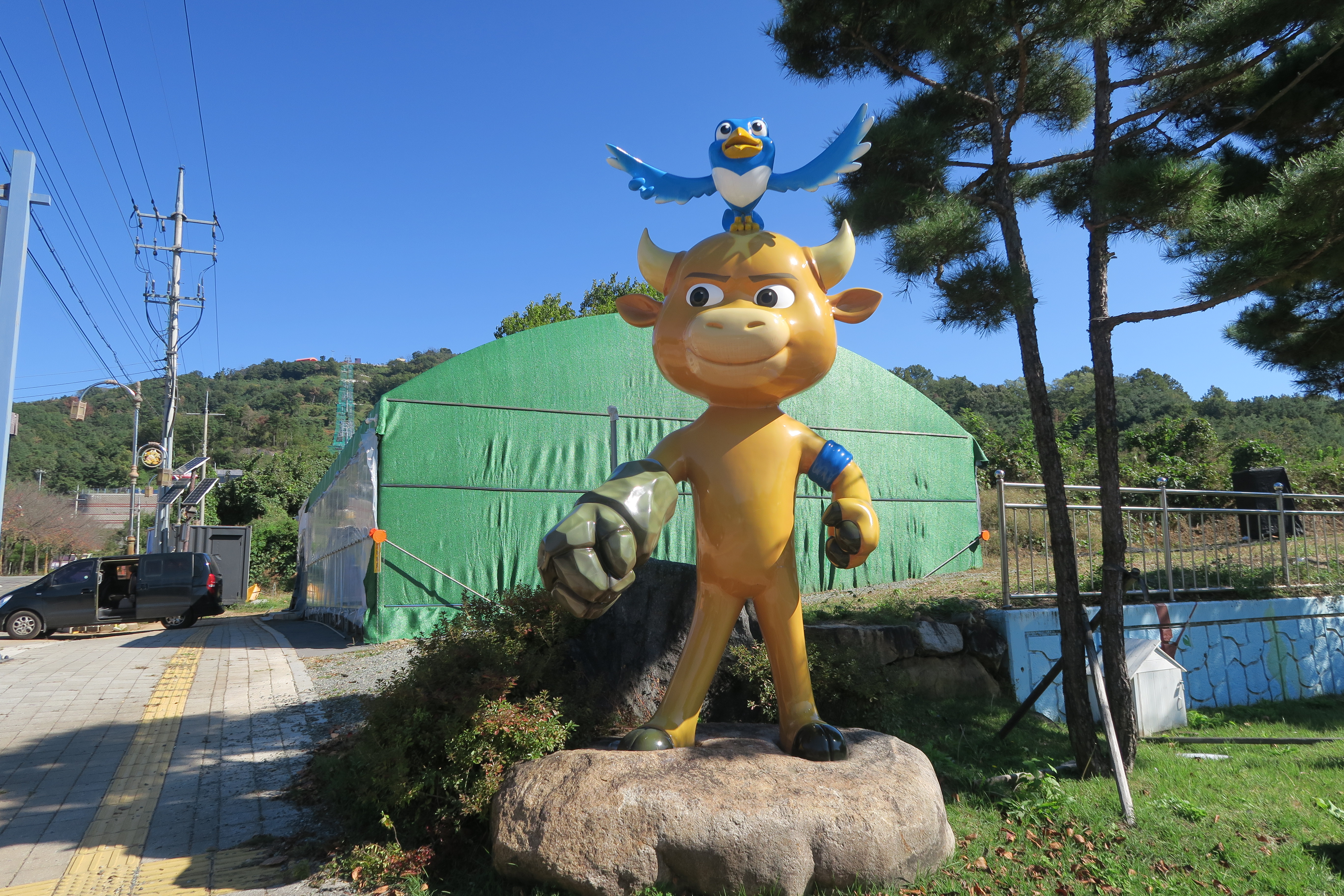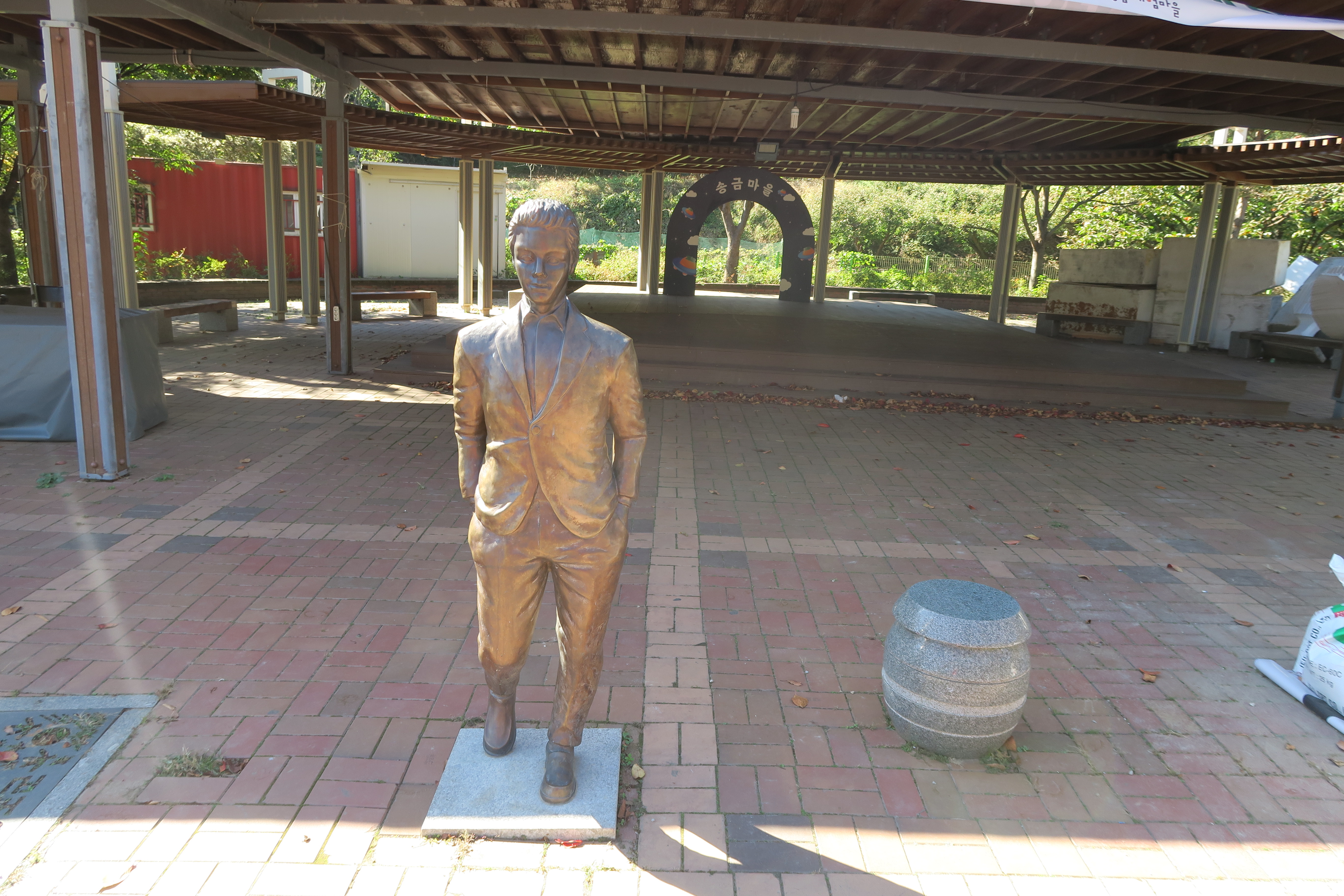 남자의 동상이 있고 간이 무대가 설치되어 있다.