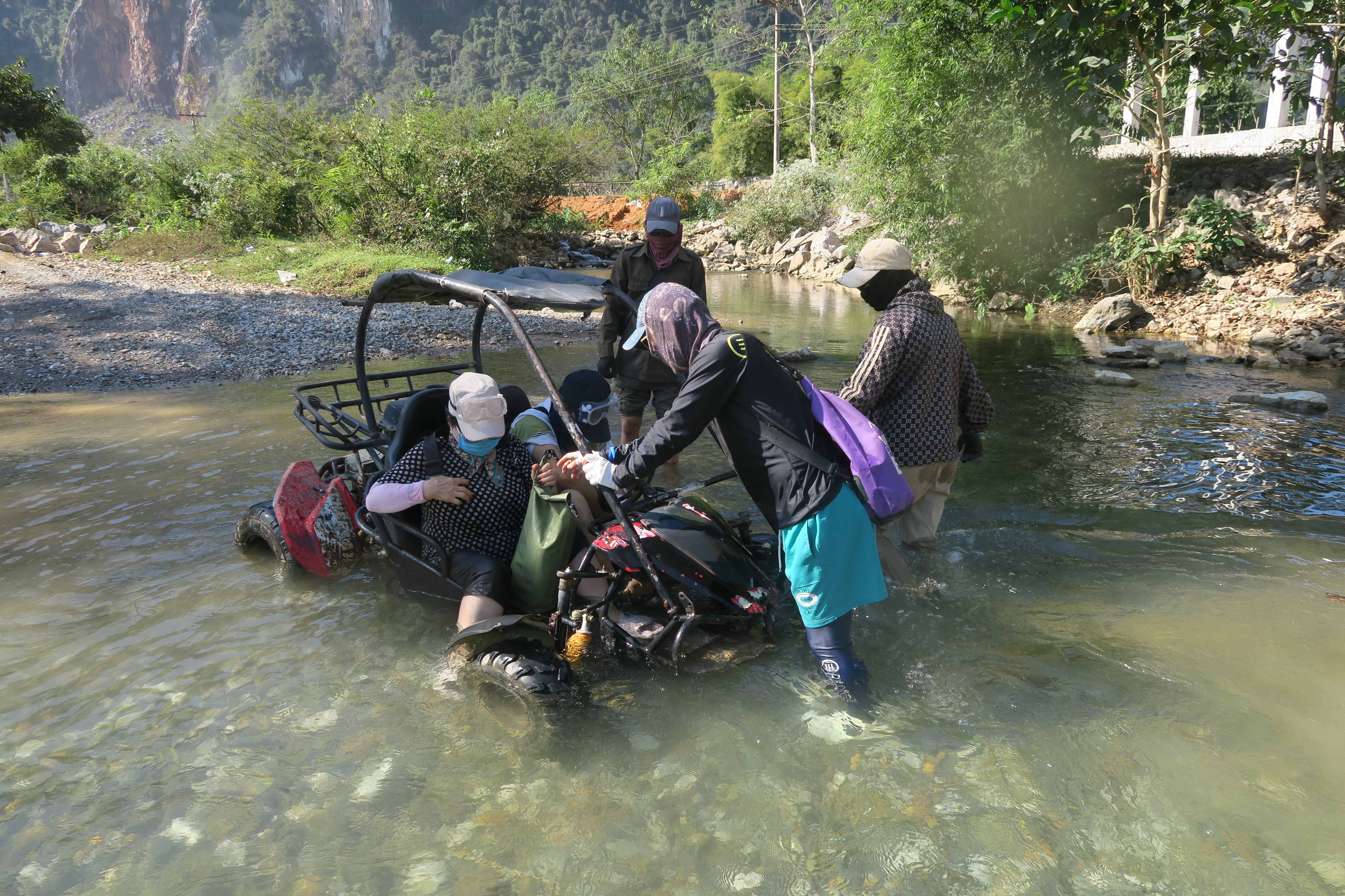 잠시 후 선두 차 도착, 안내하며 물속에서 계속 개천을 지나감.