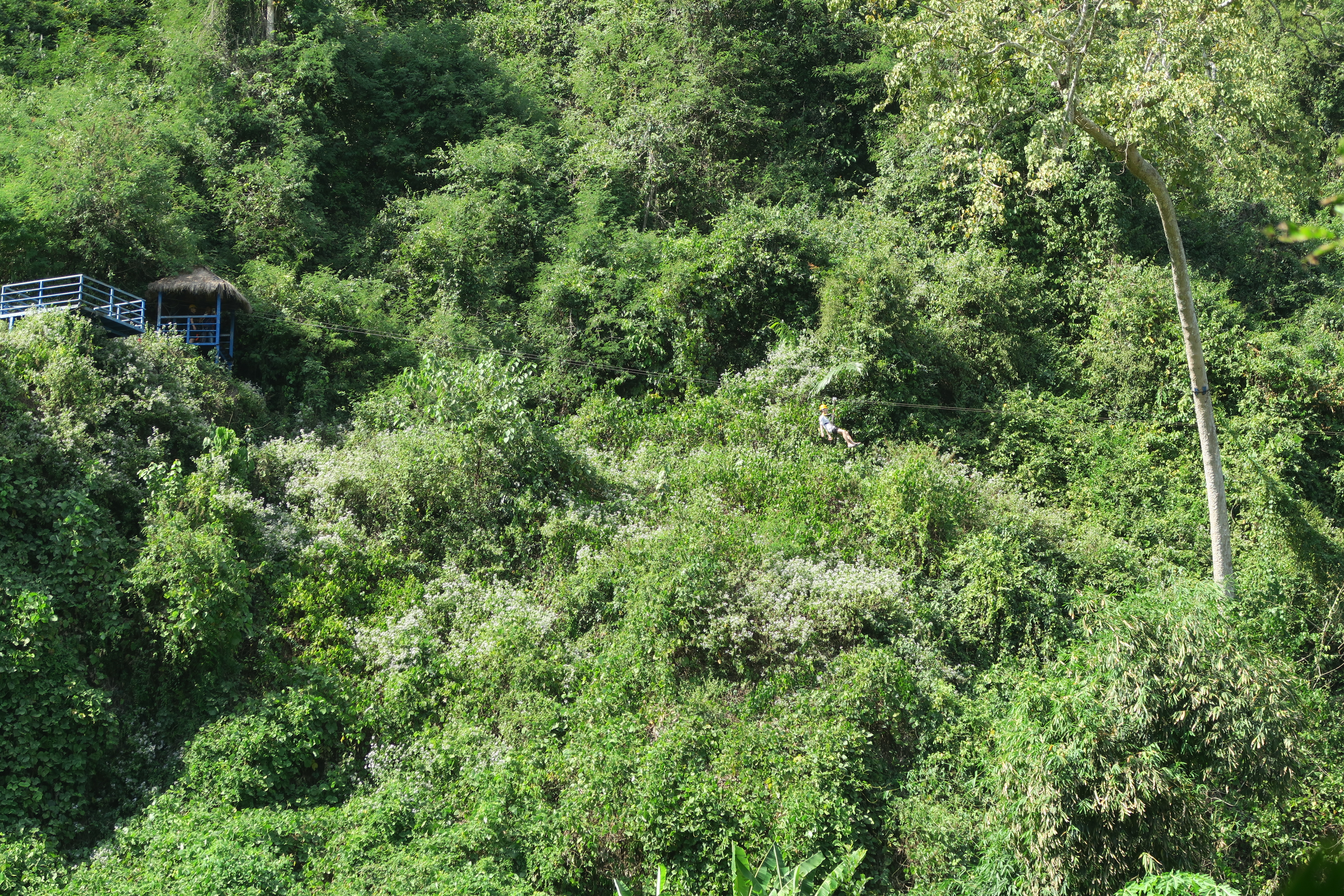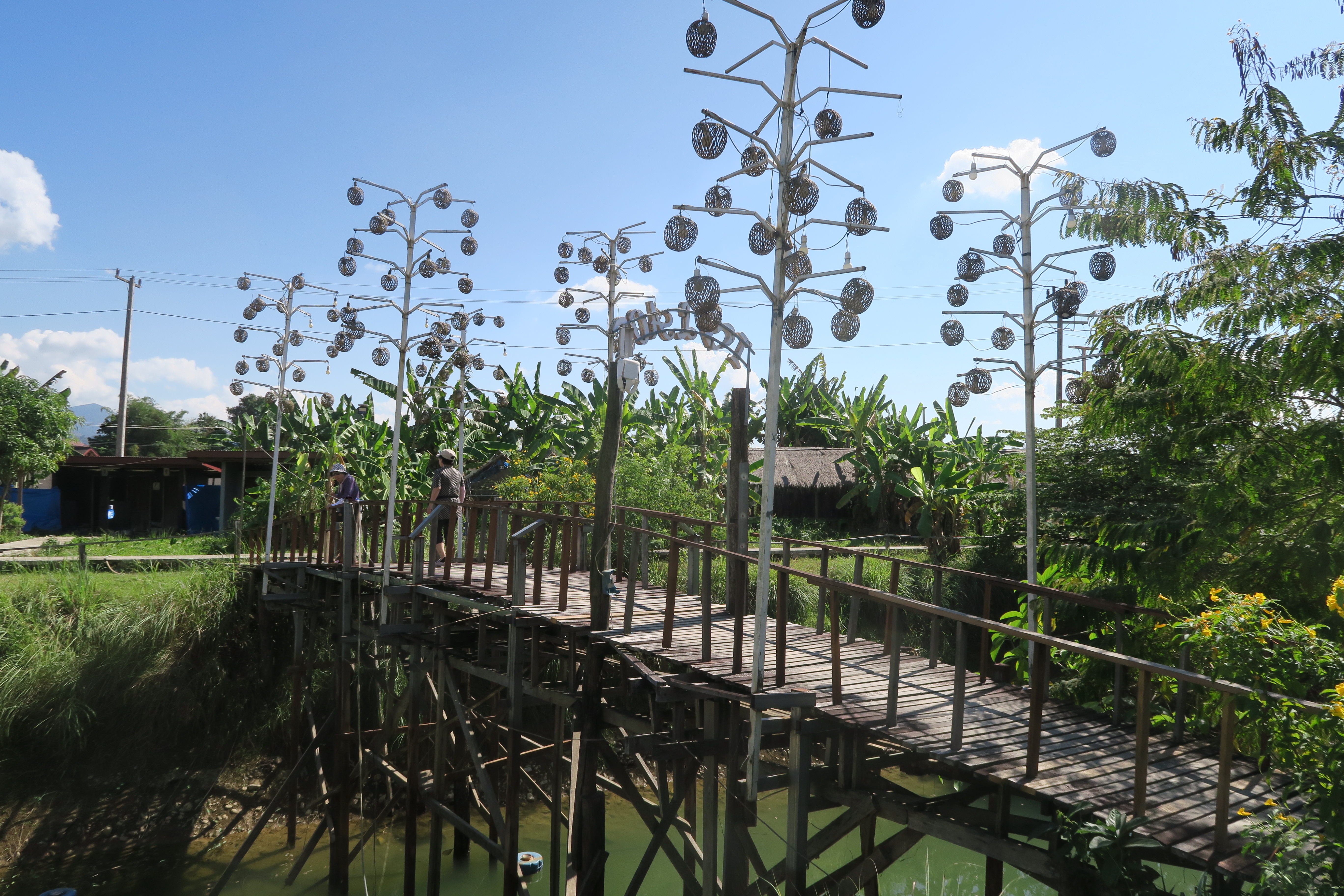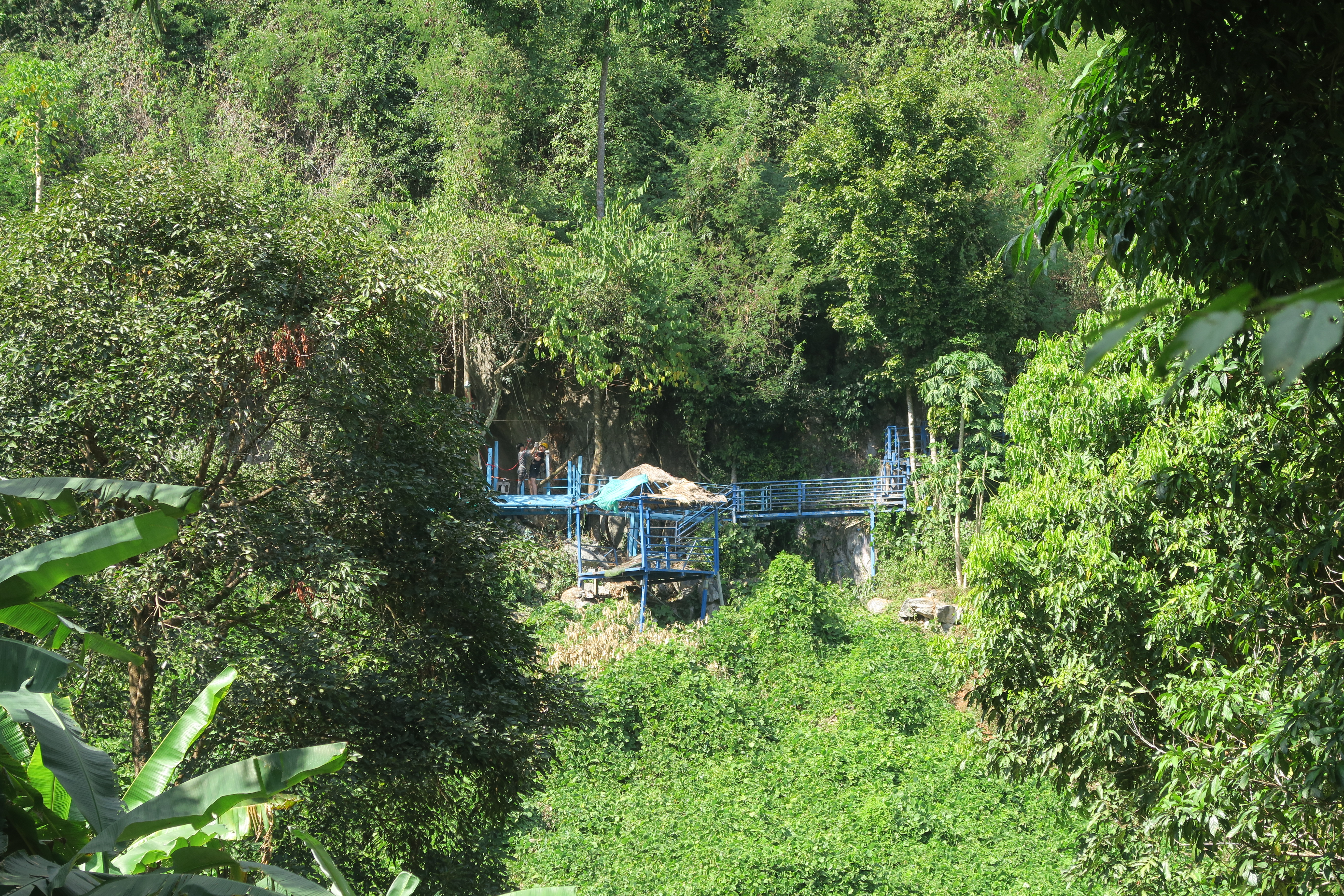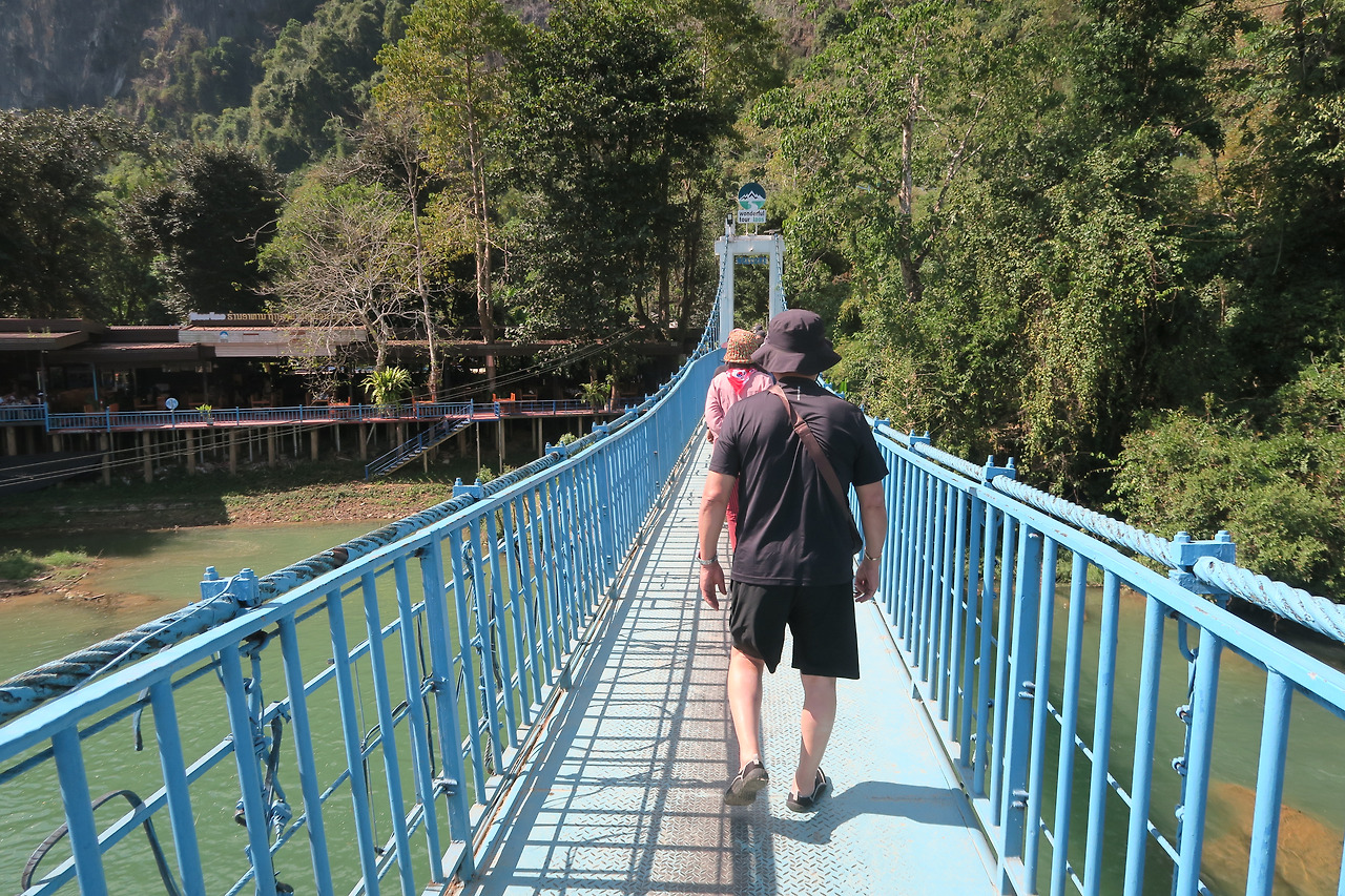 남쏭강 위에 놓인 현수교를 건너 간다.