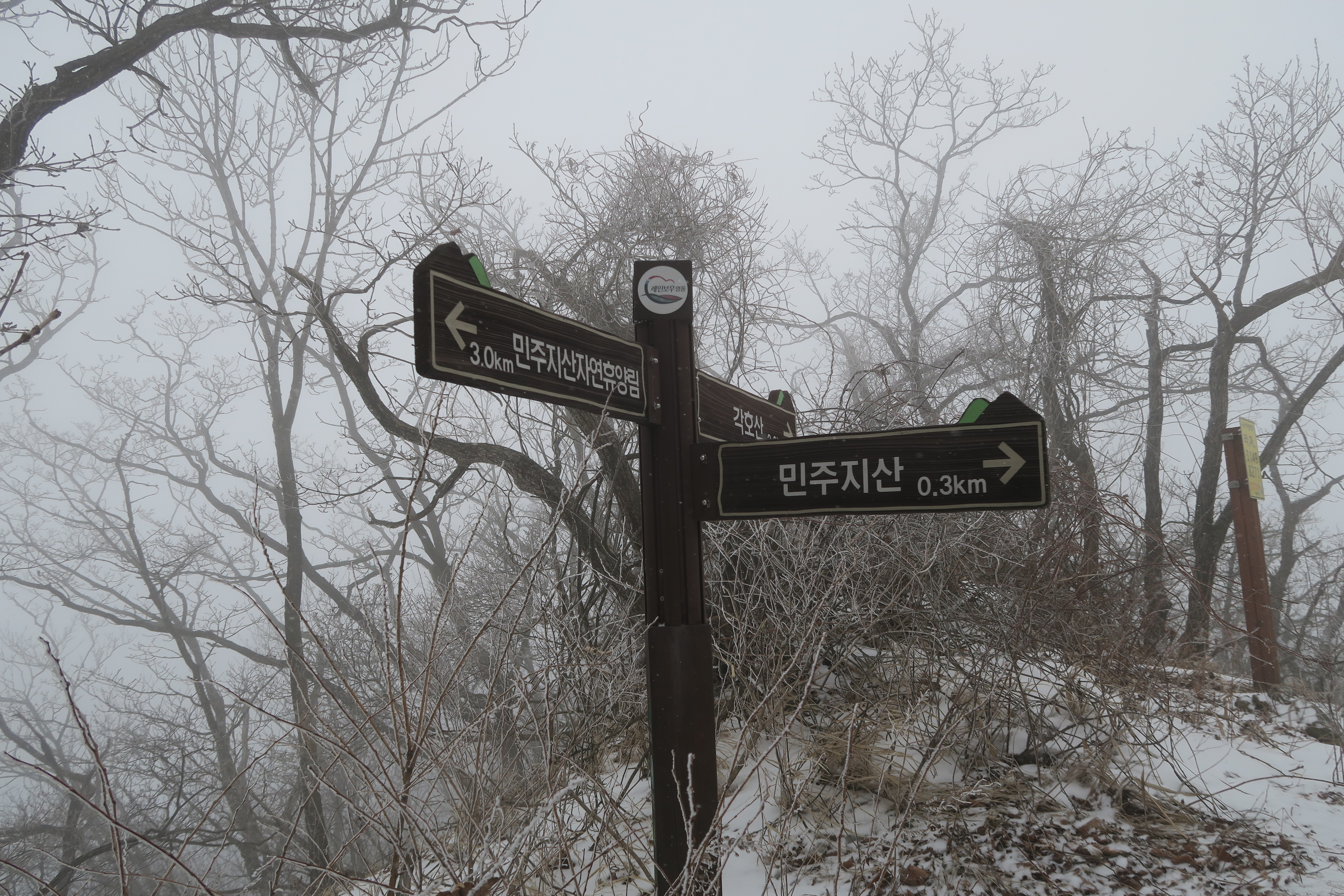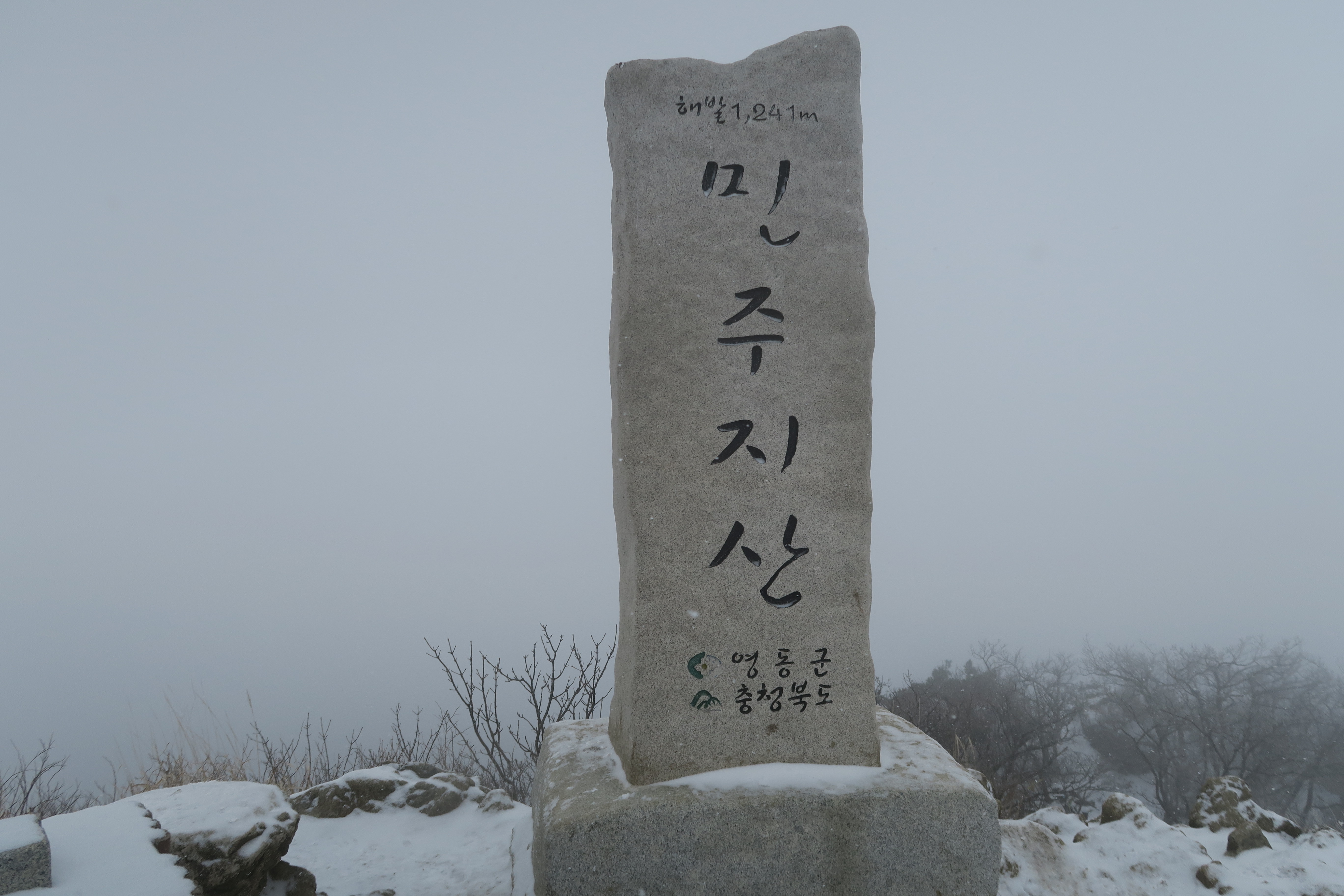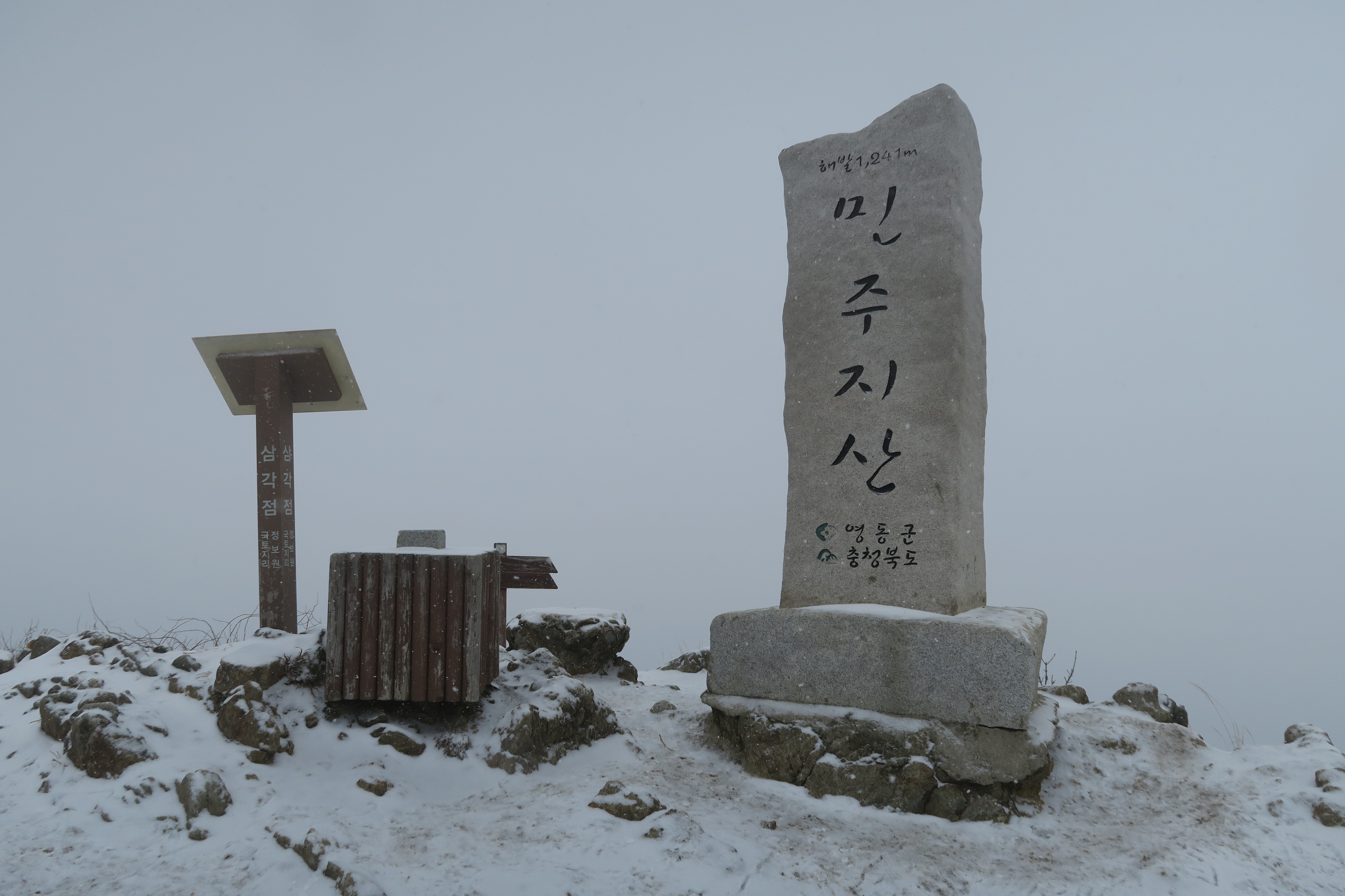 민주지산 은 부드러운 흙산의 형태를 띠고 있지만 정상부만큼은 거대한 정상석과 함께 사방이 트여 있다. 잘 조성된 전망 데크에서는 방해받지 않는 파노라마 경관을 만끽할 수 있다. 하지만 지금은 시계가 흐려 경관을 조망할수 없다