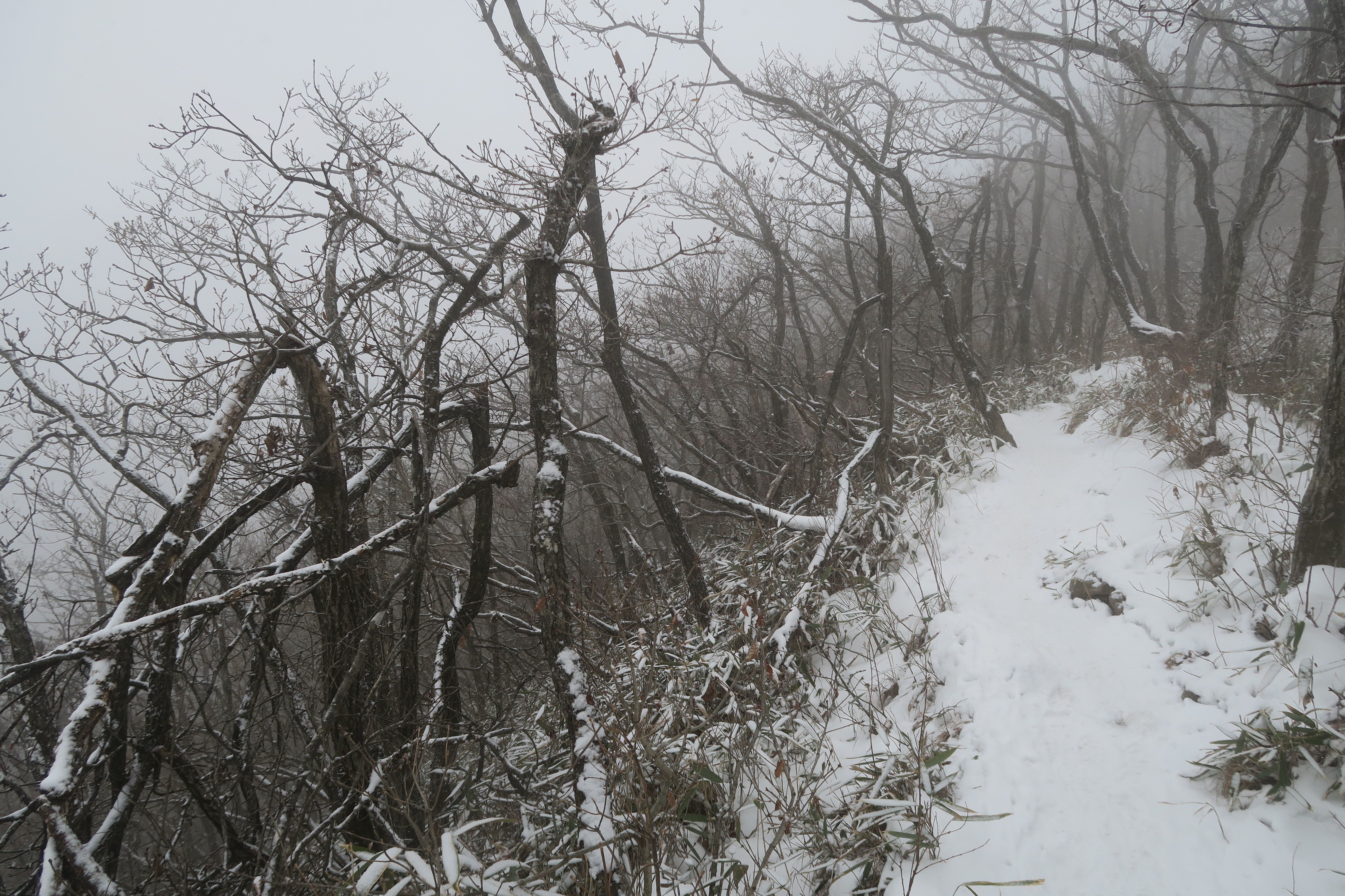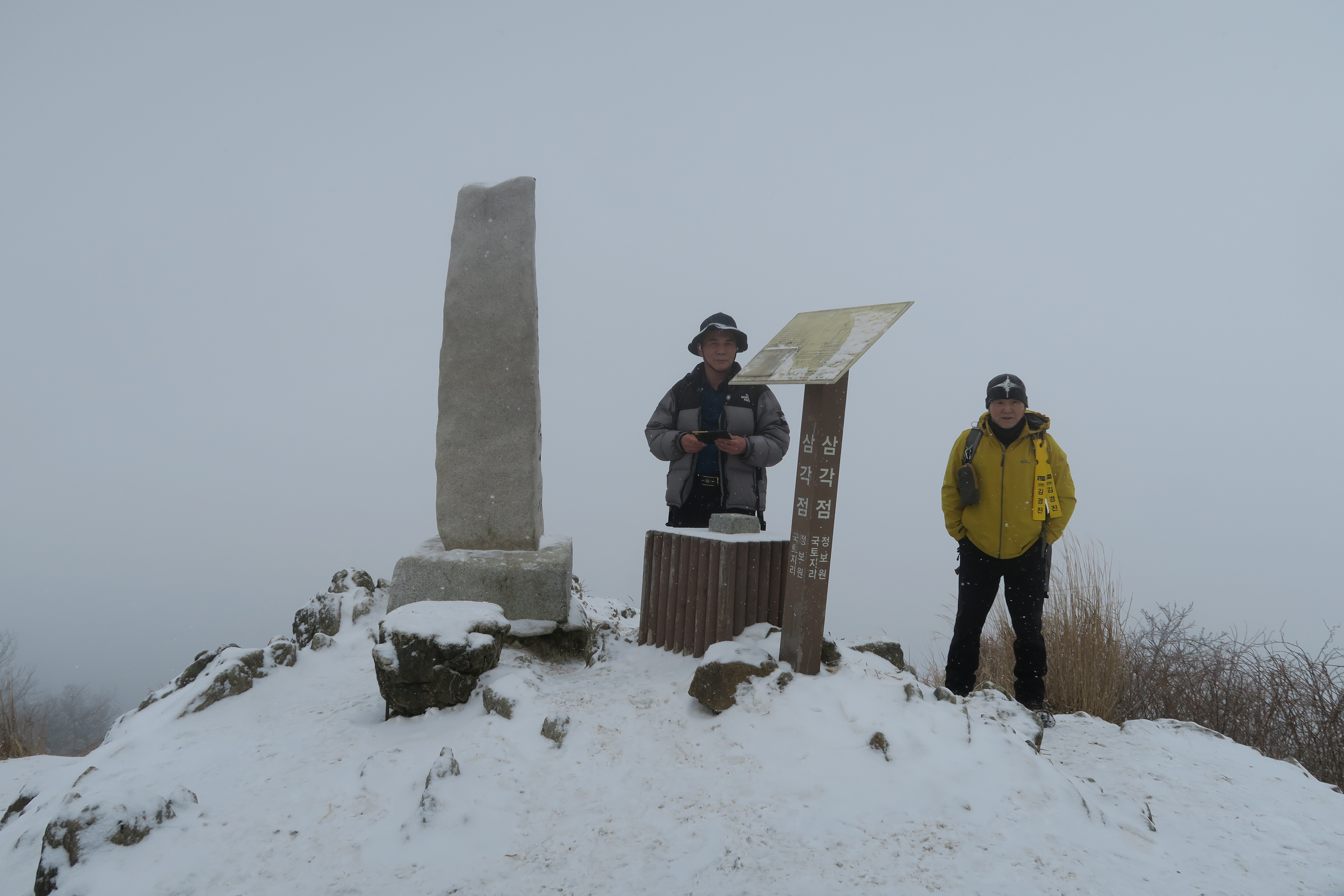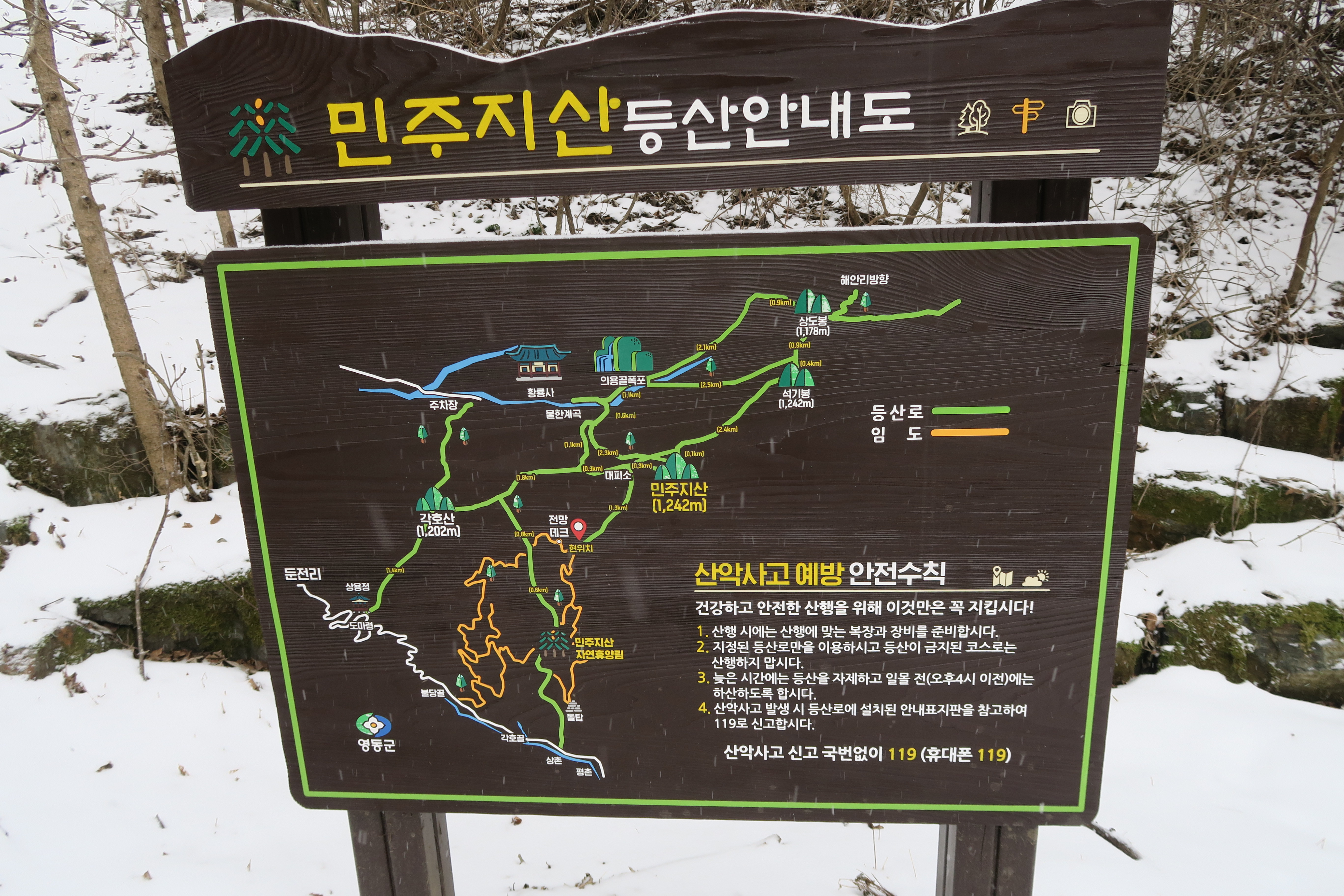 민주지산 은 부드러운 흙산의 형태를 띠고 있지만 정상부만큼은 거대한 정상석과 함께 사방이 트여 있다. 잘 조성된 전망 데크에서는 방해받지 않는 파노라마 경관을 만끽할 수 있다. 하지만 지금은 시계가 흐려 경관을 조망할수 없다
