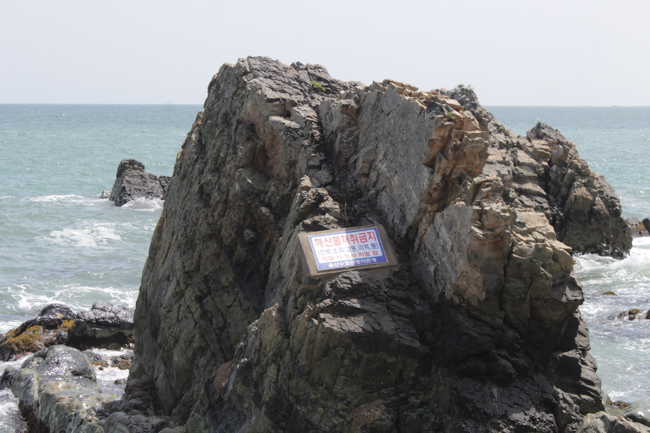 바위에 "해산물 채취금지" 안내문을 적은 이름표.